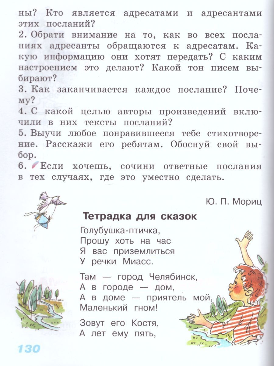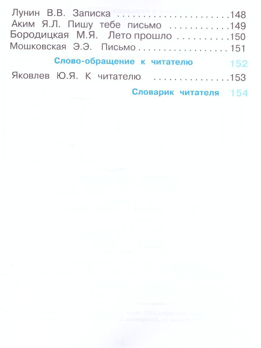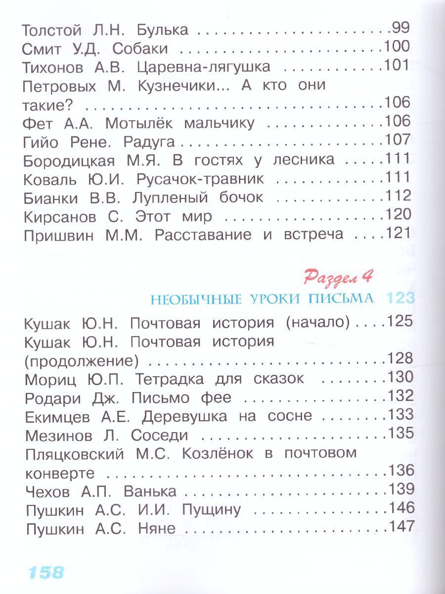 Учебник для 3-го класса состоит из двух книг. Вторая книга – 2 «Секреты рождения образа». Цель учебника – ввести ребенка в мир книги, всесторонне развить их познавательные интересы, сформировать навыки быстрого, грамотного, выразительного чтения, познакомить с разными литературными жанрами, помочь понять, как рождается художественное произведение, выстроенное по определенным литературным канонам, подтолкнуть к размышлению о прочитанном. Тщательный отбор текстового материала, оригинальная методика работы с ним нацеливают ребенка на самостоятельный поиск изобразительных средств, используемых для создания художественного образа. Способы работы с произведением, открытые детьми в диалоге с автором и собеседниками, являются важным средством для формирования чуткого, творческого, «честного» читателя. Все тексты выразительны, красочны, имеют свой ритмический рисунок. Каждый текст сопровождается творческими заданиями, дающими возможность ребенку совершенствовать технику чтения, осваивать «смысл» литературного произведения, развивать свои коммуникативные способности. Формирование и развитие культуры читательского восприятия и понимания литературного произведения как явления искусства – цель курса литературного чтения, которая в 3 классе получает новое воплощение. Читатель-ученик 3 класса знакомится с разным видением авторами новых художественных произведений окружающей действительности: явлений природы, событий, поступков героев. Открываемые читателем авторские изобразительные средства, приемы, находки, открытия писателей и поэтов помогают лучше понять замысел новых литературных текстов. Читатель открывает понятия: замысел; художественное и научное описание; словесный пейзаж; форма произведения; изобразительные средства (сравнение, эпитет, олицетворение, звукопись, метафора); лирика, лирическое произведение; художественное и научное описание животного; авторские приемы (юмор, ирония); жанр послания; адресат и адресант; образ автора; жанр рассказа; повествование. Ученик 3 класса активно работает в позициях читателя, автора, и редактора собственного сочинения. Учебник прекрасно иллюстрирован.Характеристики