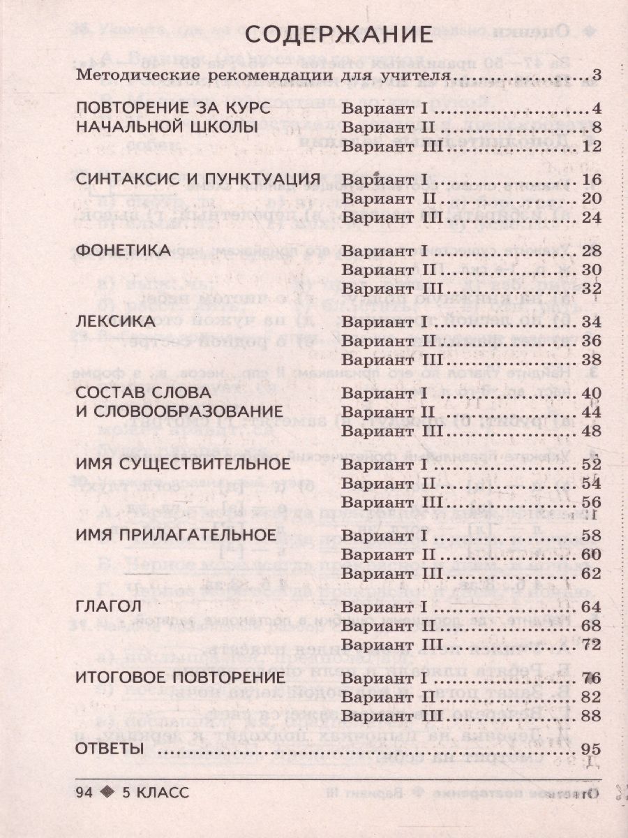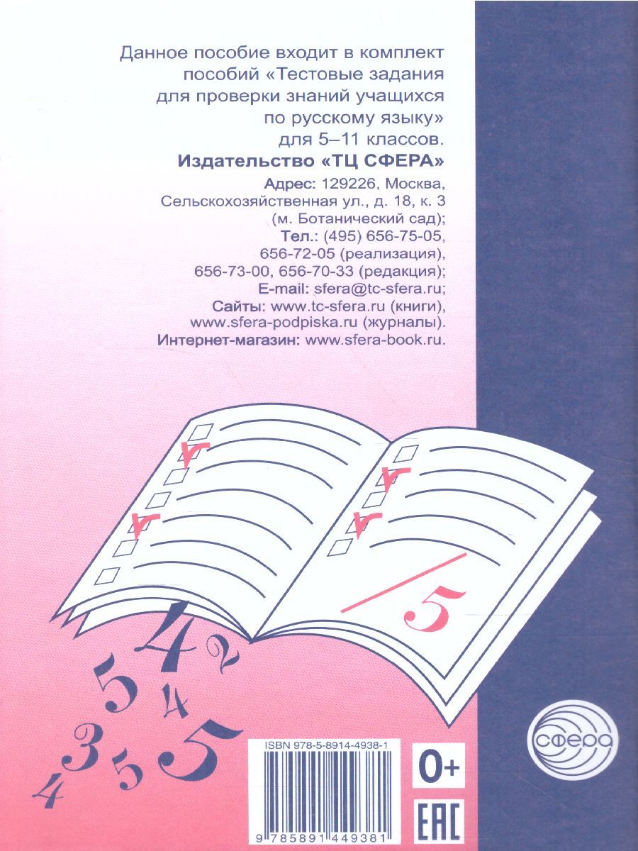 Допущено управлением общего среднего образования Министерства общего и профессионального образования Российской Федерации. Тестовые задания, составленные на основе стабильного учебника русского языка для 5-го класса (авторы Т.А. Ладыженская и др.), предназначены для итогового контроля знаний учащихся по всем темам программы. В пособии учитывается разный уровень знаний, умений и навыков учащихся: I и II варианты тестовых заданий соответствуют базовому уровню, III вариант - повышение трудности. Данное пособие входит в комплект пособий Тестовые задания для проверки знаний учащихся по русскому языку для 5-11-х классов, подготовленных издательством ТЦ Сфера.Характеристики