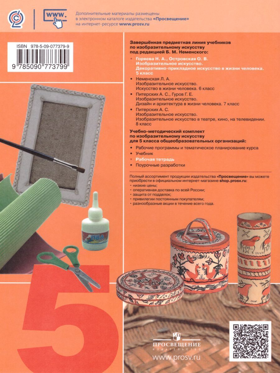Рабочая тетрадь создана по программе "Изобразительное искусство и художественный труд. 1-9 классы", разработанной под руководством народного художника России, академика РАО и PAX Б.М. Неменского. К учебнику Н.А. Горяевой, О.В. Островской "Изобразительное искусство: Декоративно-прикладное искусство в жизни человека", под редакцией Б.М. Неменского (учебный комплект для 5 класса). Рабочая тетрадь содержит различные творческие задания, которые помогут расширить и закрепить знания учащихся по основным темам учебника - традиционное народное искусство, народные художественные промыслы, современное декоративно-прикладное искусство, социальная роль декора. Тетрадь развивает художественное чутье, фантазию, воображение, помогает приобрести начала искусствоведческого анализа, умение работать с разными художественными материалами. Тетрадь можно использовать как на уроке, так и во время самостоятельных занятий ребят дома.Характеристики