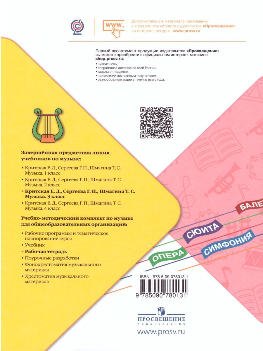 Рабочая тетрадь входит в учебно-методический комплект «Музыка» для 3 класса общеобразовательных учреждений авторов Е. Д. Критской, Г. П. Сергеевой, Т. С. Шмагиной. Она содержит вопросы и творческие задания для самостоятельной работы учащихся. Тетрадь доработана в соответствии с требованиями ФГОС.Характеристики