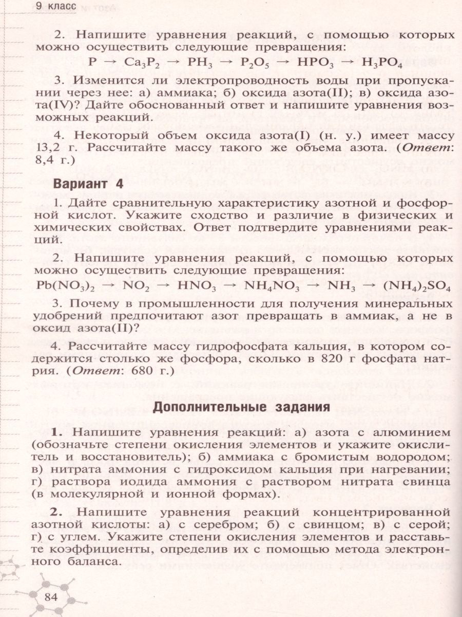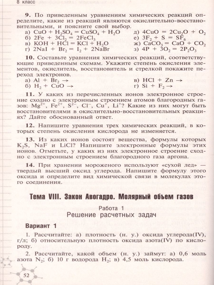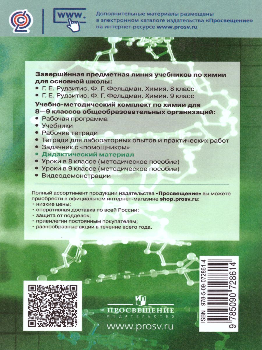 Пособие известного автора переработано в соответствии с изложением материала в учебниках 8 и 9 классов Г.Е Рудзитиса, Ф.Г. Фельдмана. Каждая работа содержит четыре варианта заданий. Задания различаются дидактическими целями: одни из них требуют от учащихся простого воспроизведения материала, другие заставляют сравнивать и анализировать, для выполнения третьих необходимо творческое осмысление и применение знаний в новых ситуациях. Приведены задания для итоговой проверки знаний учащихся.Характеристики