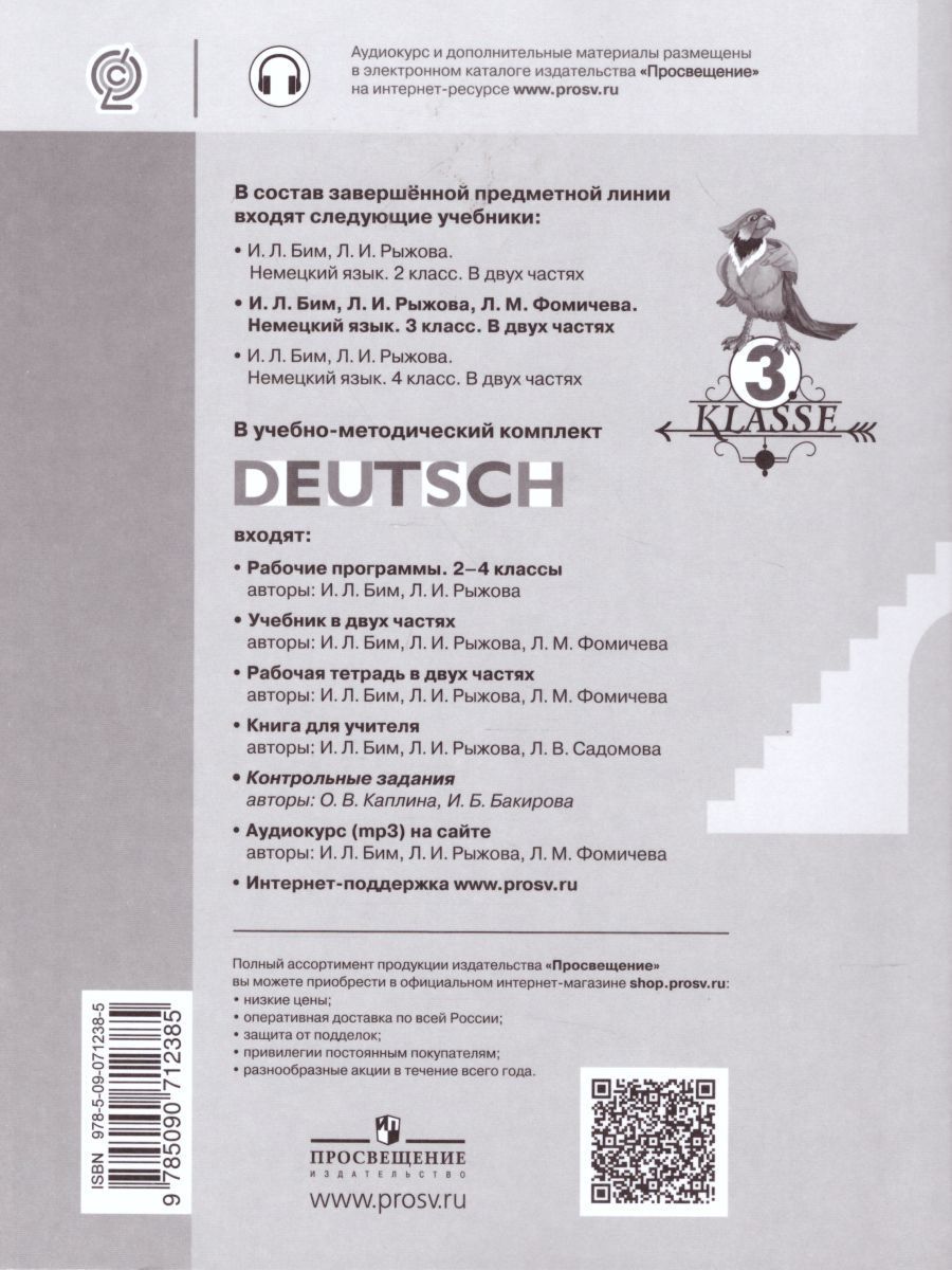 Учебное пособие "Немецкий язык. Контрольные задания. 3 класс» авторов О. В. Каплиной, И. Б. Бакировой предназначено для учащихся 3 класса (2-й год обучения) общеобразовательных организаций авторов И. Л. Бим и др.Характеристики