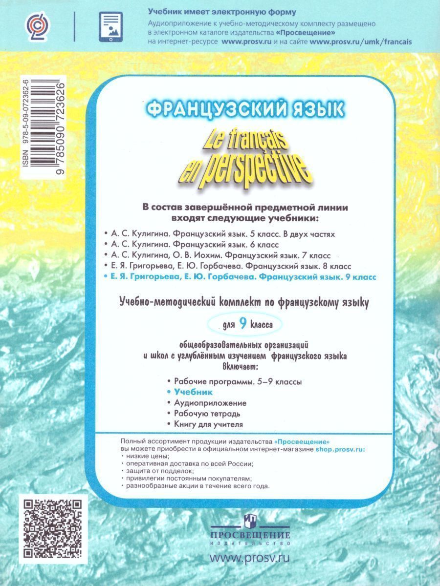Учебник «Французский язык. IX класс» является основной частью УМК для 9 класса общеобразовательных организаций и школ с углублённым (более 105 учебных часов в год) изучением французского языка линии «Французский в перспективе» («Le français en perspective»). Цель учебника – формирование и развитие способности учащихся использовать изучаемый иностранный язык как средство межкультурного и межличностного общения. Его основными особенностями являются: методическая концепция на основе коммуникативно-когнитивного подхода к обучению иностранным языкам; чёткая организация каждого блока; занимательные тексты; творческие, развивающие упражнения; использование таких образовательных технологий, как групповая работа, проектная деятельность, развивающее обучение с применением межпредметных связей; информативный страноведческий материал по литературе, истории, культуре Франции; современное красочное оформление. Учебные материалы курса доработаны в соответствии с требованиями ФГОС основного общего образования и направлены на достижение учащимися личностных, метапредметных и предметных результатов. В ходе доработки данного курса его учебные материалы дополнены проектными заданиями, ссылками на интернет-ресурсы, что позволит учащимся существенно расширить практическое применение французского языка. По сравнению с предыдущим изданием в учебнике полностью переработаны грамматические таблицы Résumons.Характеристики