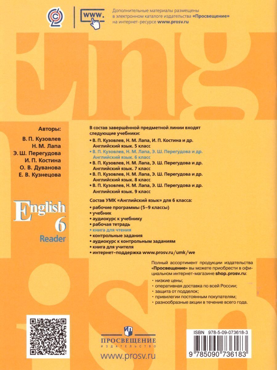 Книга для чтения является составным компонентом УМК «Английский язык» для учащихся 6 класса общеобразовательных организаций. В пособии представлены материалы для чтения в классе и самостоятельного чтения дома. Они содержат короткие рассказы, отрывки из произведений популярной детской литературы, письма, стихи, тексты, отвечающие возрастным особенностям учащихся. Тексты сопровождаются разнообразными упражнениями для развития умения читать.Характеристики
