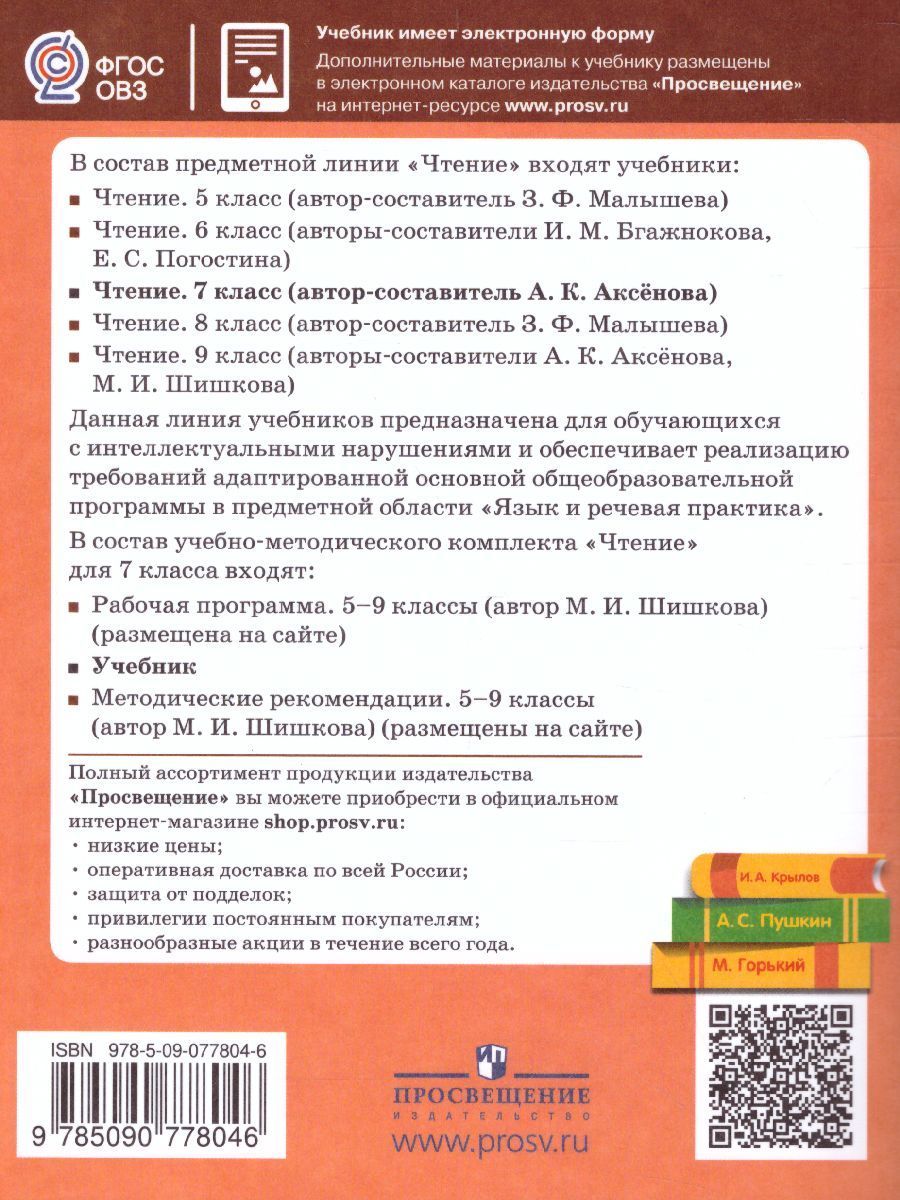 Учебник предназначен для детей с ограниченными возможностями здоровья и реализует требования адаптированной основной общеобразовательной программы в предметной области «Язык и речевая практика» для обучающихся с интеллектуальными нарушениями. В учебник включены разножанровые произведения отечественных авторов, подобранные с учётом преемственности литературного материала, изучаемого в предшествующих классах по таким темам, как «Устное народное творчество», «Из произведений русской литературы XIX века», «Из произведений русской литературы XX века». Содержание текстов и методического аппарата направлено на решение образовательных, дидактических, коррекционно-воспитательных задач с учётом познавательных и личностных особенностей учащихся с нарушением интеллекта.Характеристики