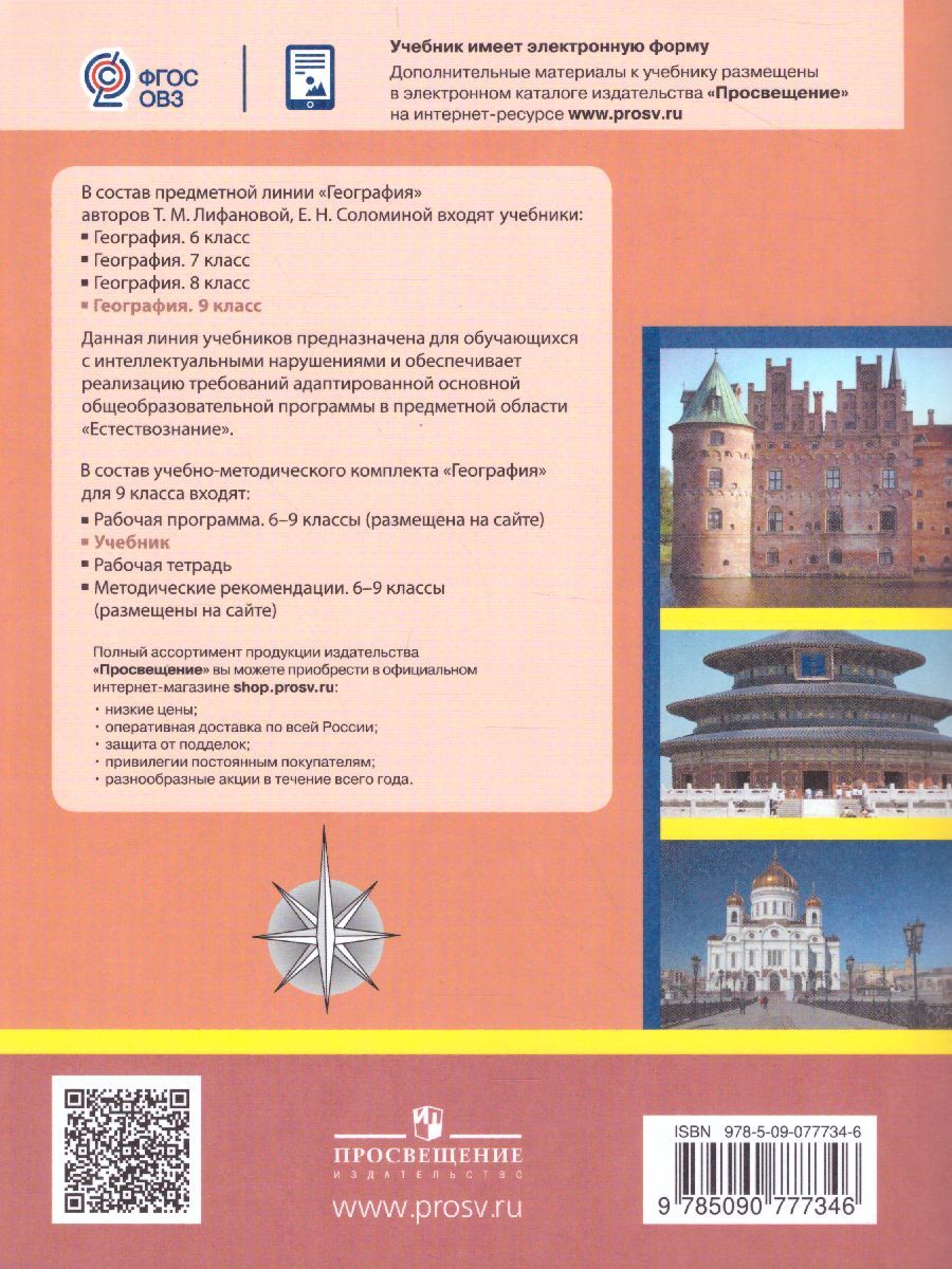 Учебник предназначен для обучающихся с интеллектуальными нарушениями и реализует требования Адаптированной основной образовательной программы в предметной области "Естествознание". Содержание учебника составляют сведения о географическом положении, рельефе, климате, водоёмах, разнообразии растительного и животного мира, населении, крупных городах Евразии. Методический аппарат учебника представлен вопросами и заданиями, размещёнными до и после каждой статьи. В конце учебника помещён словарь новых терминов. В конце каждого урока даётся дополнительная информация в рубрике "Для любознательных". Учебник составляет учебно-методический комплект с рабочей тетрадью по географии для 9 класса автора Т.М.Лифановой.Характеристики