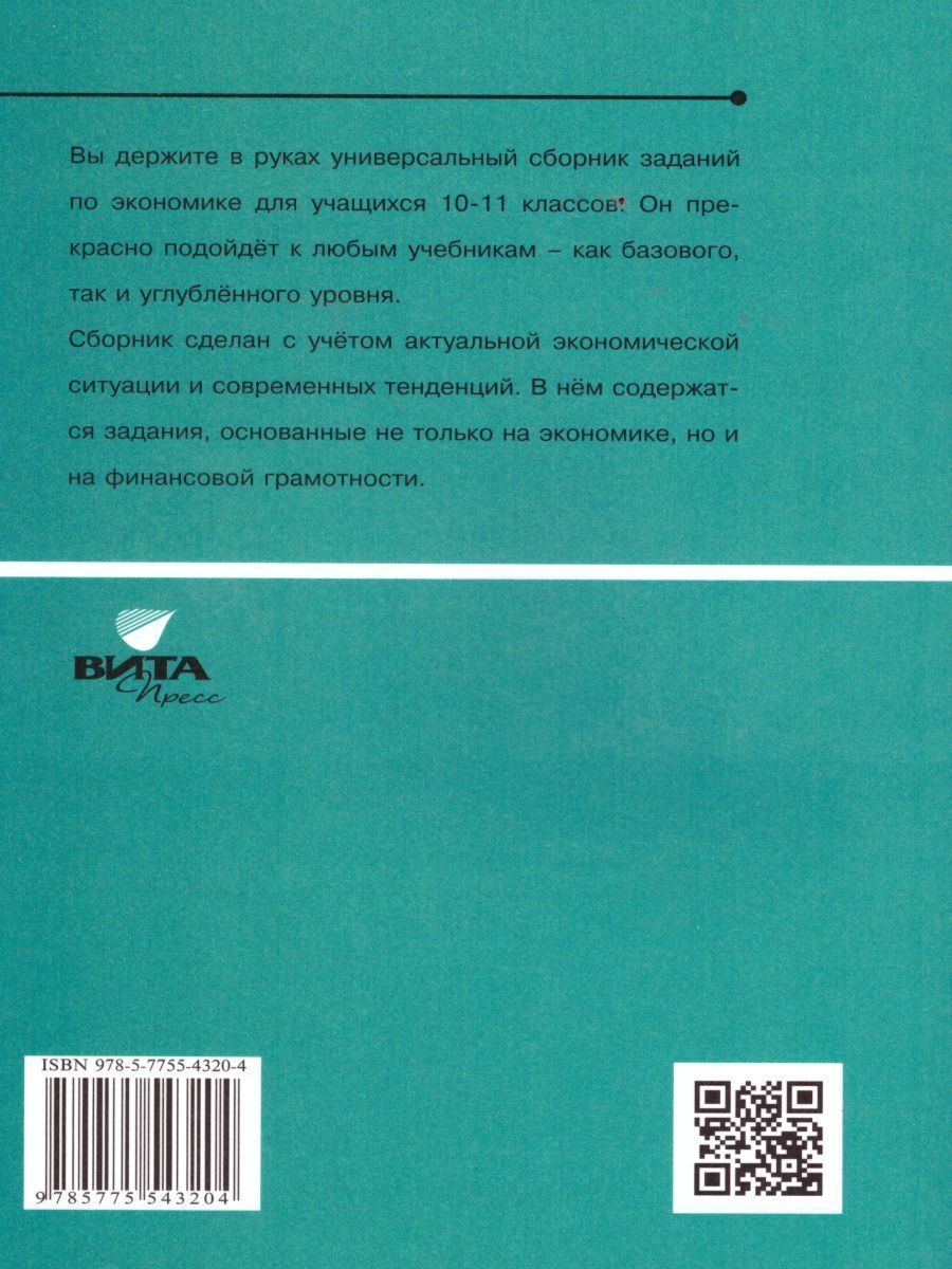 Данный сборник включает различные типы задач и заданий по экономике: от классических расчётных задач и вопросов, требующих развёрнутого ответа, до проблемных ситуаций из реальной жизни. Сборник также содержит задания на развитие навыков финансовой грамотности, что является одним из его преимуществ. В сборнике используется актуальная статистика и обсуждаются интересные экономические события, произошедшие в России и в мире, некоторые задания основаны на публикациях в СМИ. В конце сборника приводятся ответы на задания. Издание охватывает основные темы школьного курса по экономике в соответствии с примерной программой, разработанной по ФГОСу. Этот сборник адресован не только учащимся 10-11 классов, но и студентам колледжей, изучающим экономику по любым учебникам как на базовом, так и на углублённом уровне, а также учителям и преподавателям.Характеристики