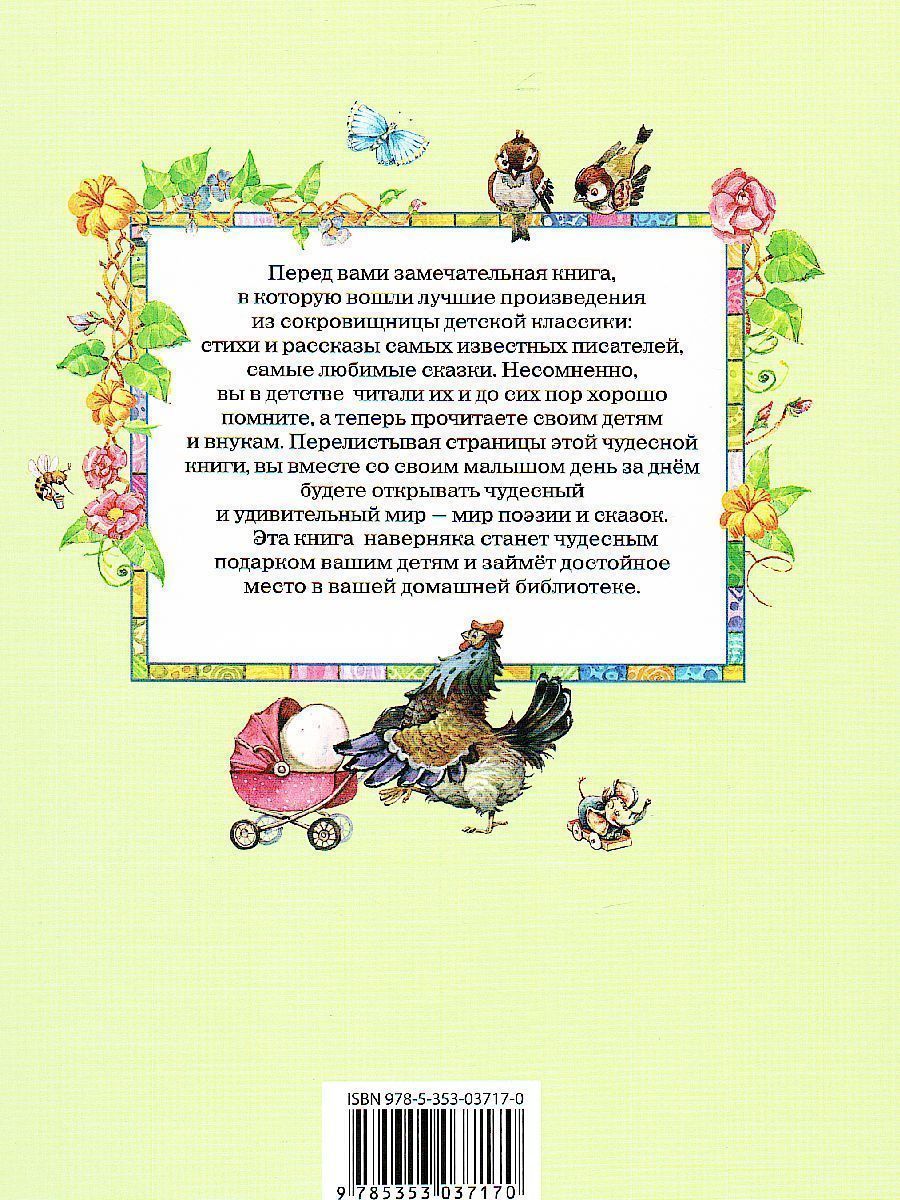 Перед вами замечательная книга, в которую вошли лучшие произведения из сокровищницы детской классики: * стихи и рассказы самых известных писателей, самые любимые сказки. Несомненно, вы в детстве читали их и до сих пор хорошо помните, а теперь прочитаете своим детям и внукам. Перелистывая страницы этой чудесной книги, вы вместе со своим малышом день за днём будете открывать чудесный и удивительный мир — мир поэзии и сказок. Эта книга наверняка станет чудесным подарком вашим детям и займёт достойное место в вашей домашней библиотеке.Характеристики