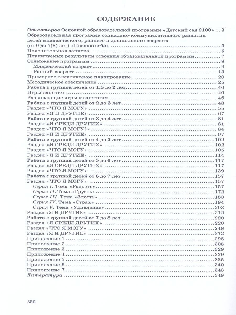 Данное методическое пособие для педагогов и родителей является составной частью комплекта пособий, реализующих Основную образовательную программу "Детский сад 2100" и обеспечивающих социально-коммуникативное развитие детей дошкольного возраста. В методическое пособие включены программа социально-коммуникативно- : го развития детей младенческого, раннего и дошкольного возраста "Познаю себя", примерное тематическое планирование, а также методические рекомендации по организации непосредственно образовательной деятельности с детьми от 1,5 до 7(8) лет.Характеристики