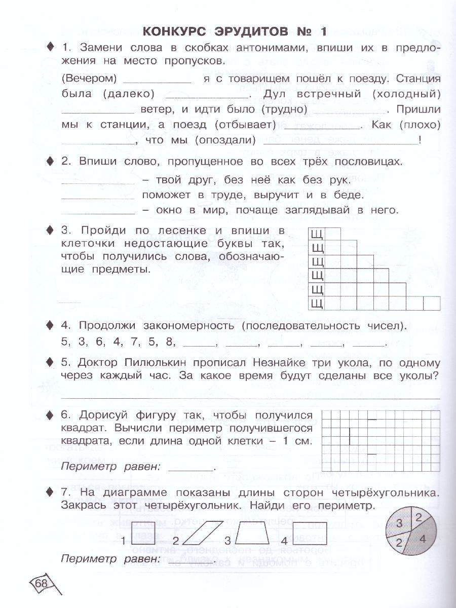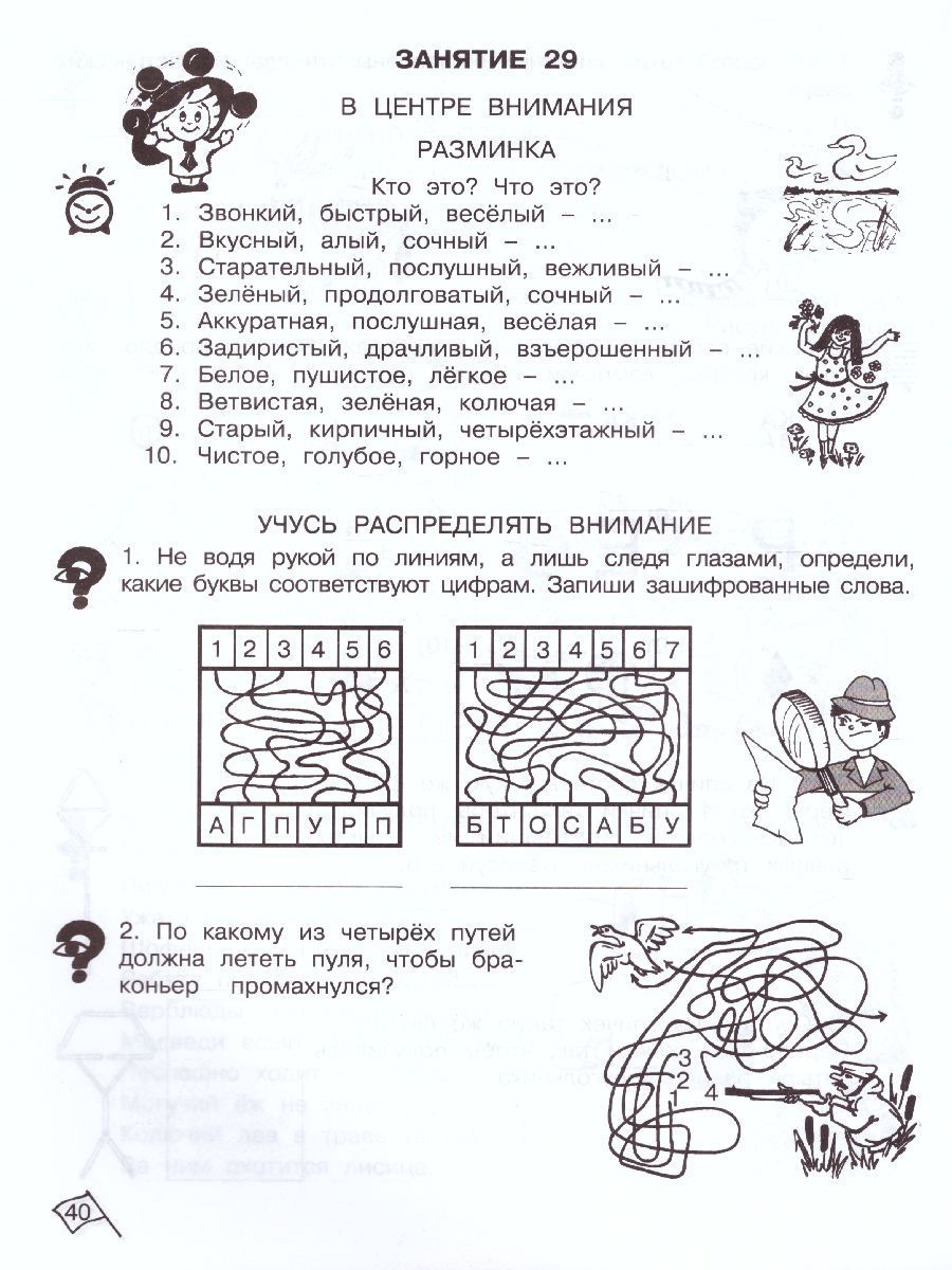 Данное пособие продолжает систему работы по развитию познавательных способностей детей. Оно ориентировано на детей 7-8 лет и помогает им освоить программу 2 класса общеобразовательной школы. Упражнения, выполненные в определённой последовательности, обеспечивают комплексное развитие различных видов памяти, внимания, развивают наблюдательность, воображение; способствуют развитию сенсорной и двигательной сфер ребёнка, формируют нестандартное мышление. Задания, разработанные в системе, могут быть использованы на уроках математики, информатики, логики. Пособие поможет также педагогам групп продлённого дня при организации свободного времени учащихся и руководителям кружковой работы при составлении заданий игрового и творческого характера. Данный курс является общественно признанной авторской методикой. Рабочие тетради апробированы и по ним успешно занимаются в школах различного уровня. Пособие соответствует федеральному государственному образовательному стандарту начального общего образования (ФГОС второго поколенХарактеристики