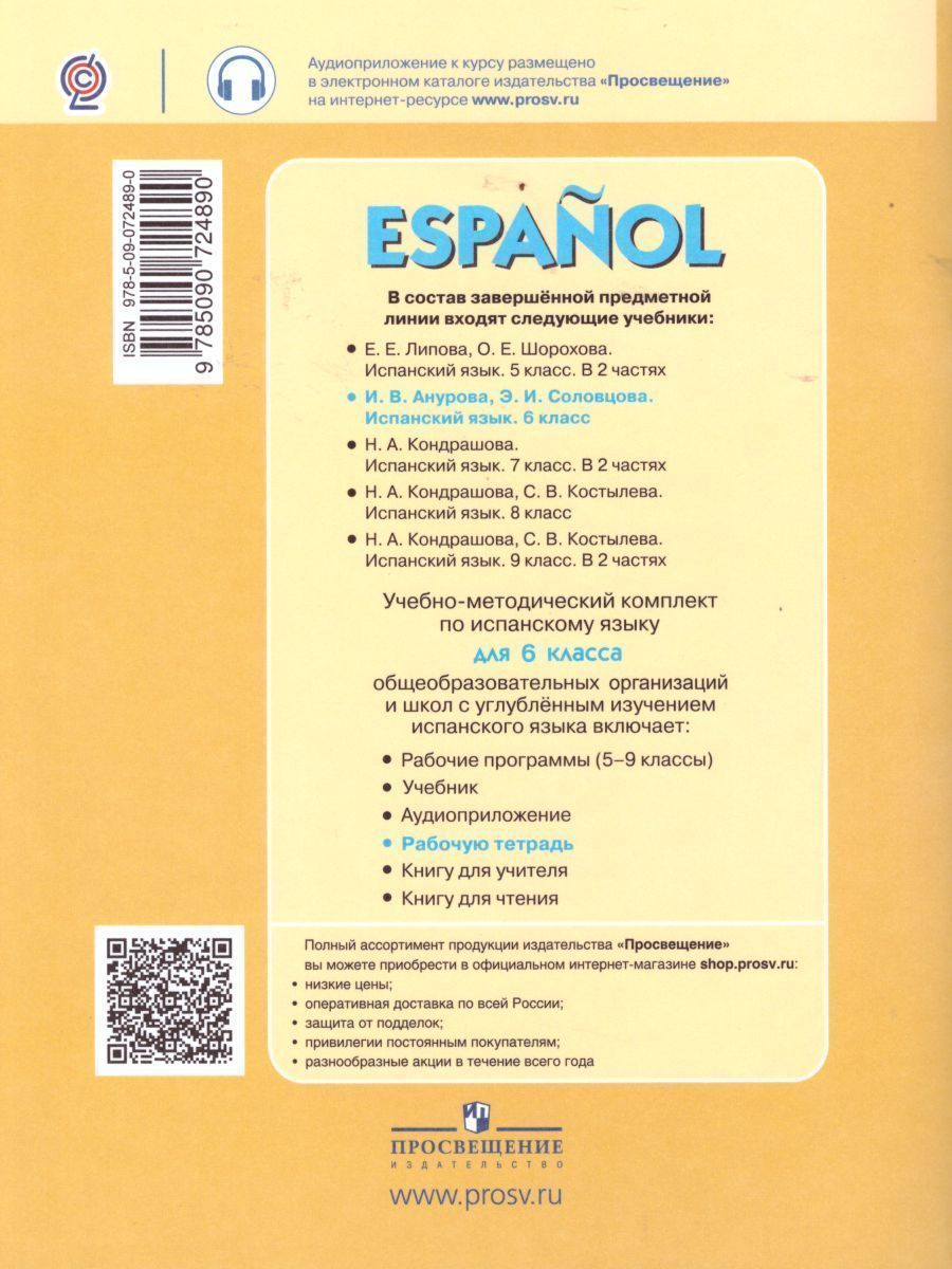 Рабочая тетрадь по испанскому языку "Espanol. Cuaderno de actividades" для учеников 6-го класса. Рабочая тетрадь является одним из обязательных компонентов учебно-методического комплекта для VI класса общеобразовательных организаций и школ с углублённым изучением испанского языка. Рабочая тетрадь включает большое количество разнообразных упражнений по всем видам речевой деятельности тренировочного и творческого характера и служит для закрепления материала, пройденного на уроке.Характеристики