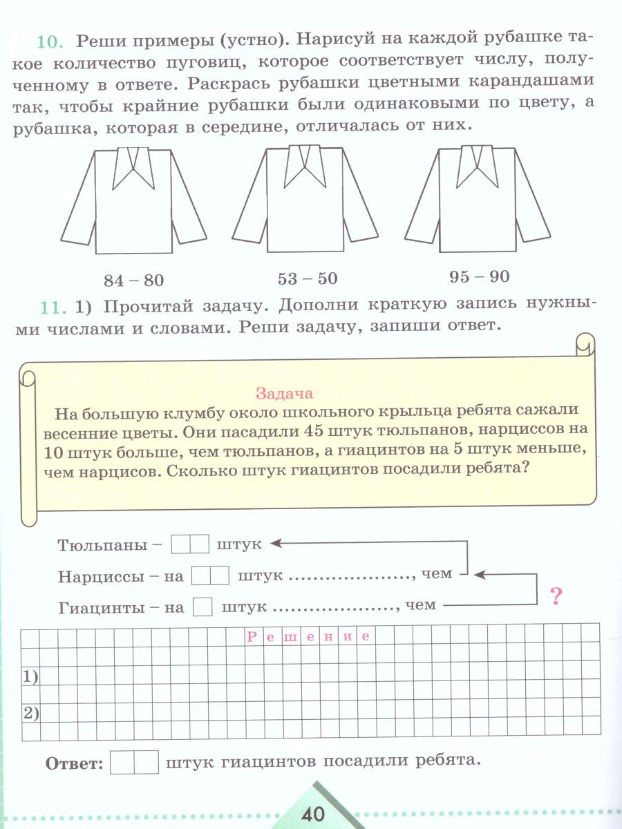 Во второй части рабочей тетради учащиеся выполняют задания с числами в пределах 100 и арифметические действия с ними. Здесь же представлена система упражнений по обобщению и систематизации знаний и навыков учащихся по выполнению умножения и деления чисел в пределах 20, даны задания по изучению чисел, полученных при измерении величин, и на геометрический материал.Характеристики