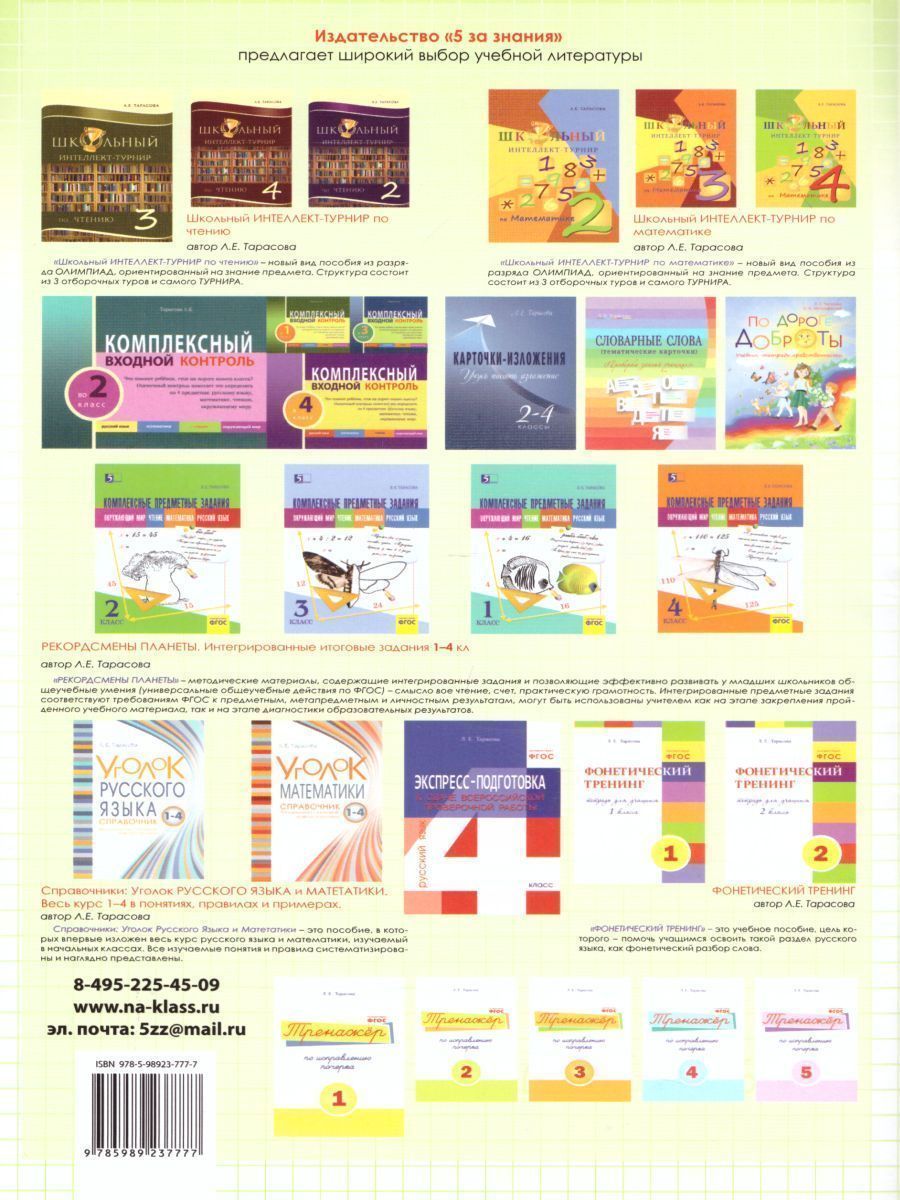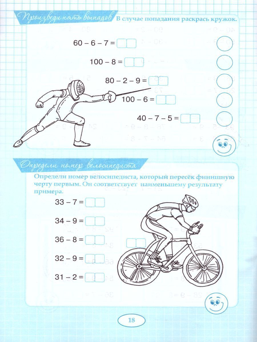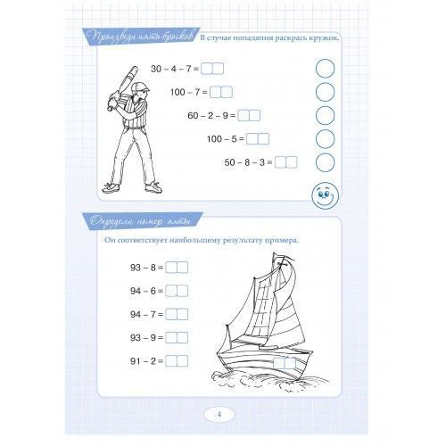 Пять шагов к пятёрке" - новый вид тренажёра, целью которого является тренировка учащихся в усвоении таблицы сложения-вычитания чисел. В данной тетради представлены примеры с переходом через десяток. Для облегчения процесса тренировки нами разделены действия: отдельно даётся вычитание, отдельно сложение. Чтобы не утомлять ребёнка однообразием счёта, нами вставлены после парных однотипных страниц игровые страницы. В данной тетради предусмотрена возможность оценить правильность счёта: раскрасить лицо клоуна. Есть задания на нахождение неизвестного числа, на сравнение выражений, а также на составление числовых выражений. Последнее, пятое задание, на странице направлено на скорость, поэтому его можно использовать с секундомером. Центральные страницы-контрольные - предварительно можно вырвать и использовать на этапе контроля знаний после прохождения всей тетради. "Пять шагов к пятёрке" адресован широкому кругу учащихся разных школ, работающих на базе разных учебных пособий.Характеристики