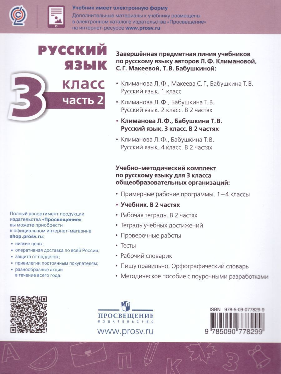 Содержание учебника направлено на формирование у обучающихся функциональной грамотности и коммуникативной компетентности. Обучение строится на основе коммуникативного подхода. Коммуникативно-речевая ориентация курса предполагает интенсивное развитие всех видов речевого общения: слушания, говорения, чтения и письма. Познавательная направленность курса даёт возможность реализовать важнейшую функцию языка - познание действительности, повышает интерес детей к обучению. Семиотический (знаковый) подход в изучении языка помогает развивать мышление и даёт возможность осмыслить язык как знаковую систему, осознать понятия "слово" и "предмет", "форма" и "содержание". Материал учебника позволяет организовать дифференцированное обучение и обеспечивает достижение личностных, предметных и метапредметных результатов освоения Основной образовательной программы начального общего образования.Характеристики