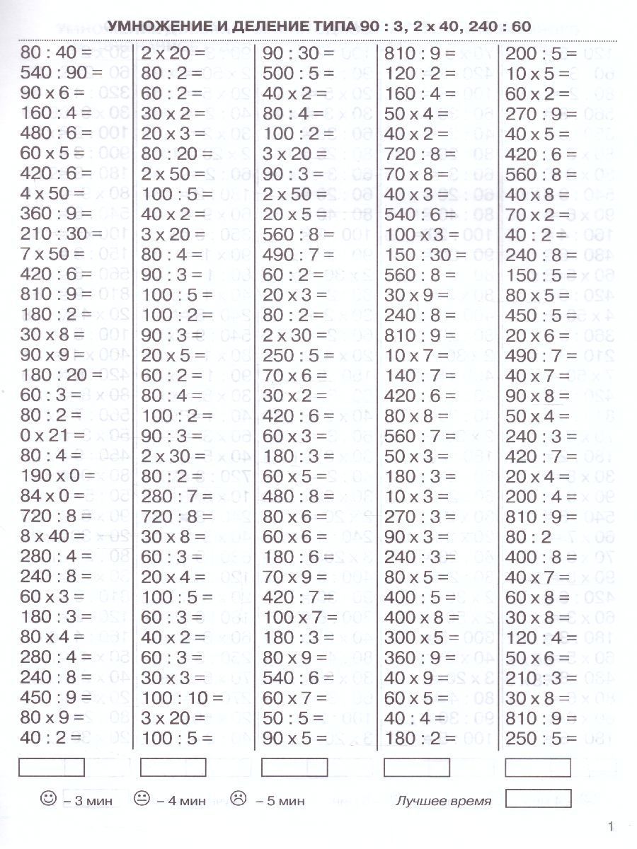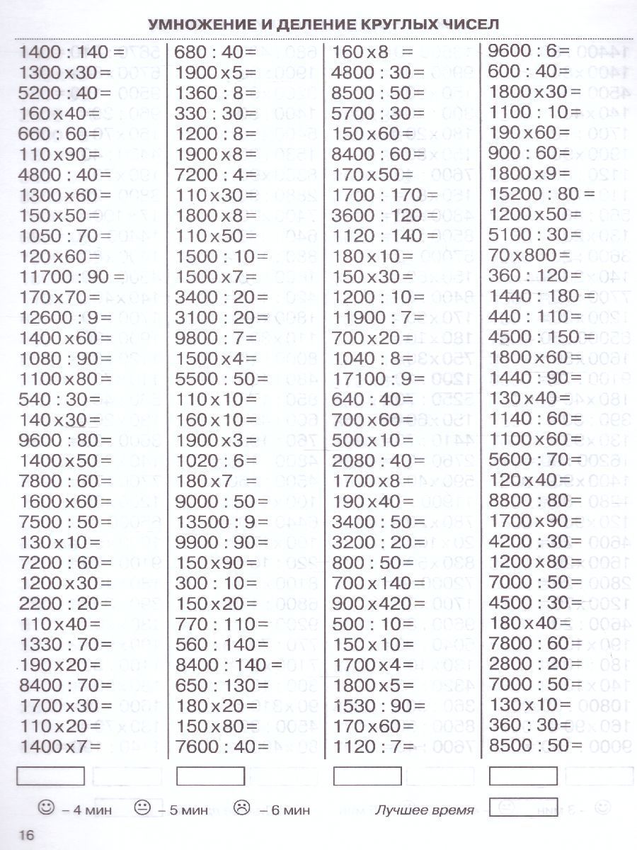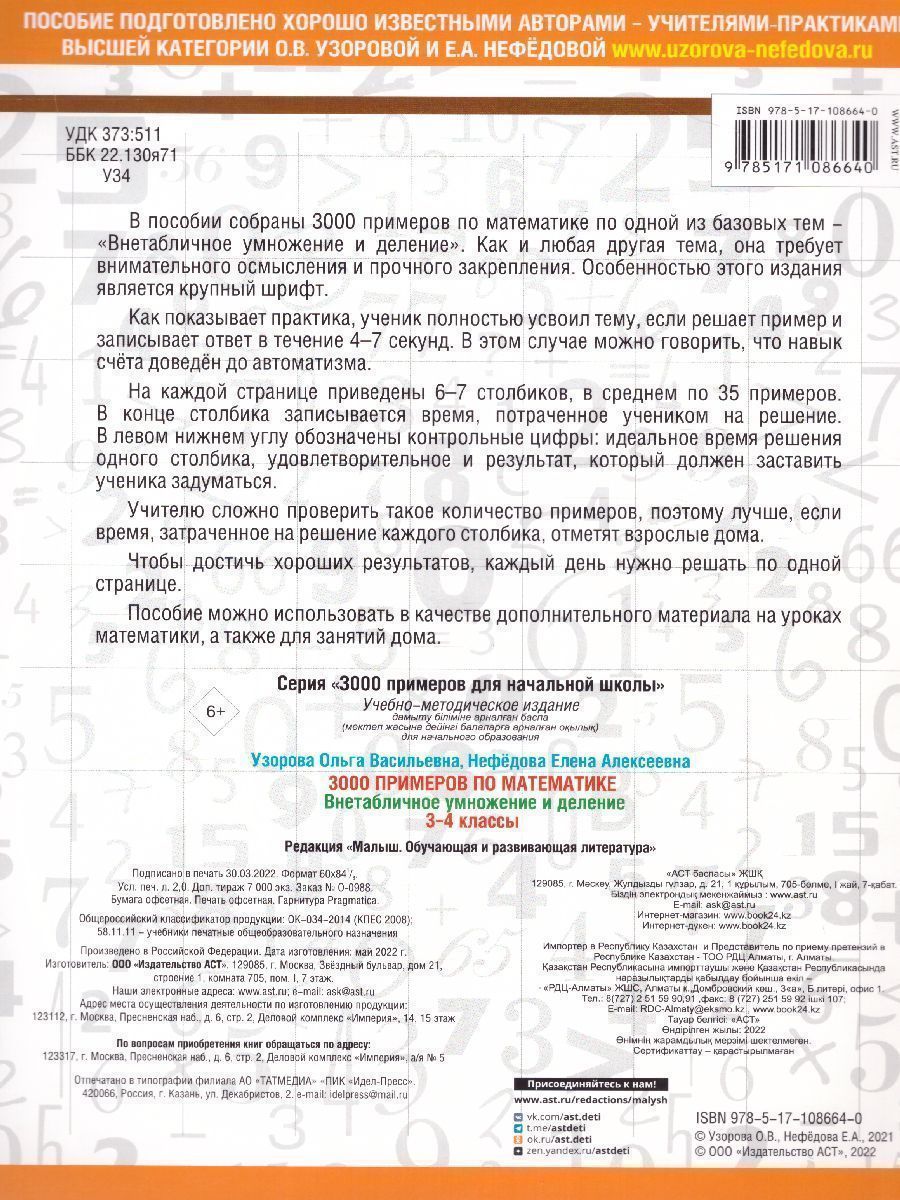 В пособии собраны 3000 новых примеров по математике по одной из базовых тем - "Внетабличное умножение и деление". Как и любая другая тема, она требует внимательного осмысления и прочного закрепления. Особенностью этого издания является крупный шрифт. Как показывает практика, ученик полностью усвоил тему, если решает пример и записывает ответ в течение 4-7 секунд. В этом случае можно говорить, что навык счета доведен до автоматизма. На каждой странице приведены 6-7 столбиков, в среднем по 35 примеров. В конце столбика записывается время, потраченное учеником на решение. В левом нижнем углу обозначены контрольные цифры: идеальное время решения одного столбика, удовлетворительное и результат, который должен заставить ученика задуматься. Учителю сложно проверить такое количество примеров, поэтому лучше, если время, затраченное на решение каждого столбика, отметят взрослые дома. Чтобы достичь хороших результатов, каждый день нужно решать по одной странице. Пособие можно использовать в качестве дополнительного матеХарактеристики