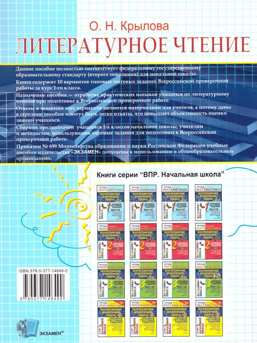 Данное пособие полностью соответствует федеральному государственному образовательному стандарту (второго поколения) для начальной школы. Книга содержит 10 вариантов типовых тестовых заданий Всероссийской проверочной работы за курс 1-го класса. Назначение пособия - отработка практических навыков учащихся по литературному чтению при подготовке к Всероссийской проверочной работе. Ответы к заданиям всех вариантов являются материалами для учителя, а потому даны в середине пособия и могут быть легко изъяты, что повышает объективность оценки знаний учащихся. Сборник предназначен для учащихся 1-х классов начальной школы, учителей и методистов, использующих типовые тестовые задания для подготовки к Всероссийской проверочной работе.Характеристики