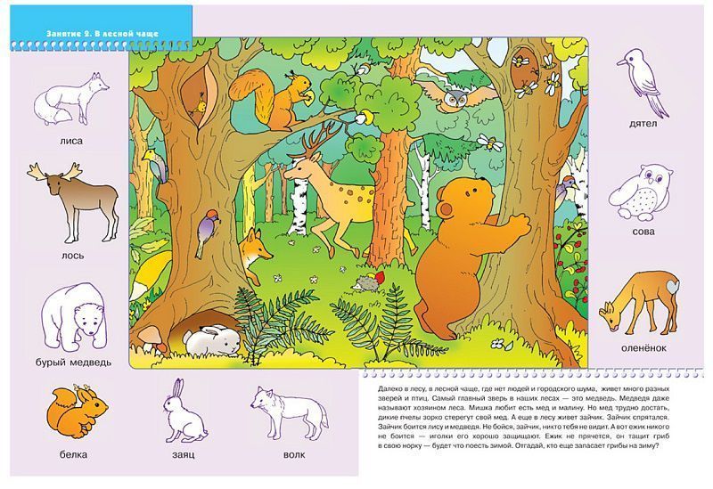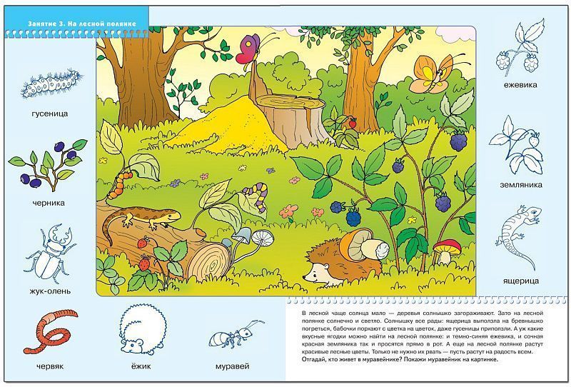 У книг этой серии голубые обложки. Для малышей от 2 лет до 3 лет издательством выпущено 12 книжек. В каждой - разнообразные задания на какую-то одну тему, великолепная вкладка-дидактический материал внутри, подробные рекомендации по работе с пособием для родителей. Все книги очень качественные, яркие. Обложка глянцевая, книгу приятно взять в руки и предложить ребенку. Книга "На лесной полянке" развивающей серии "Школа семи гномов" прекрасно подойдет для ознакомления ребенка 2-3 лет с окружающим миром. Рассматривая картинки, отвечая на вопросы в книге, малыш развивает словарный запас и мышление. В книге вас ждет увлекательная игра. Вырежьте маленькие картинки с насекомыми, животными и растениями, разложите перед малышом, попросите его найти определенную карточку. Эту картинку нужно наклеить в нужное место на полях. Также вам предлагается картонная вкладка с бумажными заготовками бабочки и жука. Их нужно вырезать, раскрасить и использовать в играх с малышом или для украшения детской. Занятия поХарактеристики