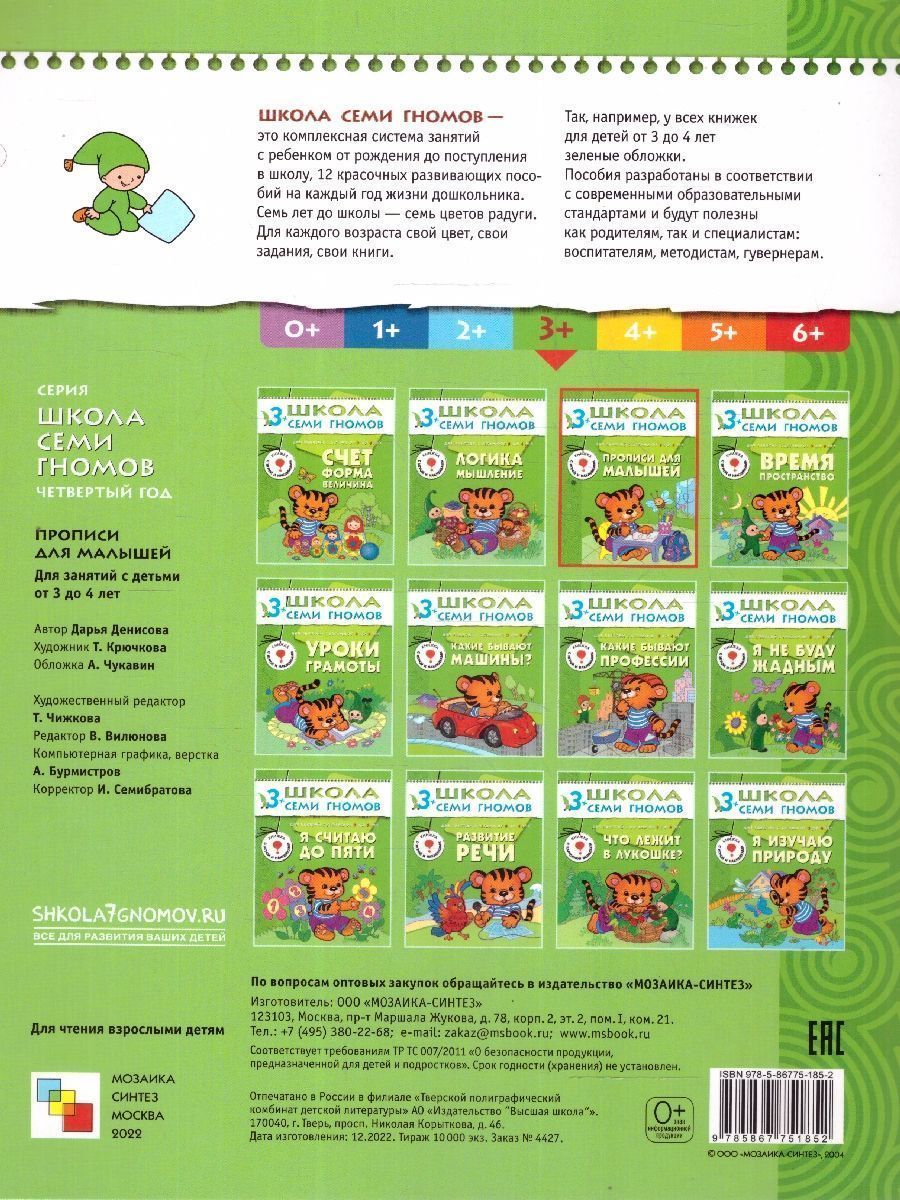 "Школа семи гномов" - это комплексная система занятий с ребенком от рождения до поступления в школу, по 12 красочных развивающих пособий на каждый год жизни ребенка-дошкольника. Для каждого возраста свой цвет, свой гномик, свои книги. Так, например, у всех книжек для детей в возрасте 3-4 лет зеленые обложки. Семь лет до школы - семь цветов радуги.Характеристики