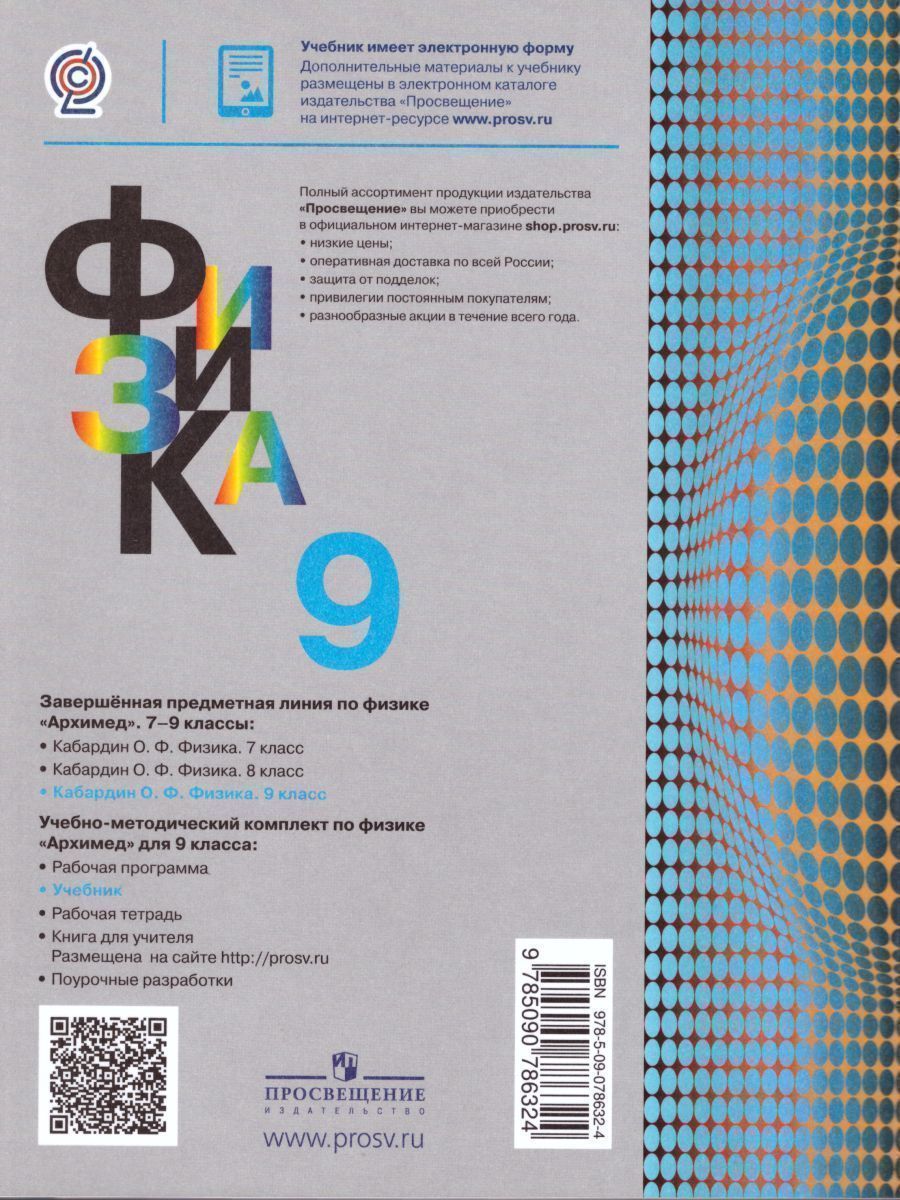 Учебник продолжает линиюУМК "Архимед" по физике, которая направлена на достижение образовательных результатов (личностных, метапредметных и предметных) по физике в соответствии с требованиями Федерального государственного образовательного стандарта основного общего образования. Учебник имеет фиксированный формат. Материал учебника предполагает изучение всех тем курса физики на уровне ознакомления с физическими явлениями, формирования основных физических понятий, определения физических величин, приобретения умения измерять физические величины, применения полученных знаний на практике. Учебник содержит рубрики, соответствующие видам учебной деятельности ("Экспериментальное задание", "Прочитайте", "Найдите", "Дискуссия", "Темы сообщений" и др.). В нём содержатся тестовые задания для проверки усвоения учащимися полученных знаний и умений.Характеристики