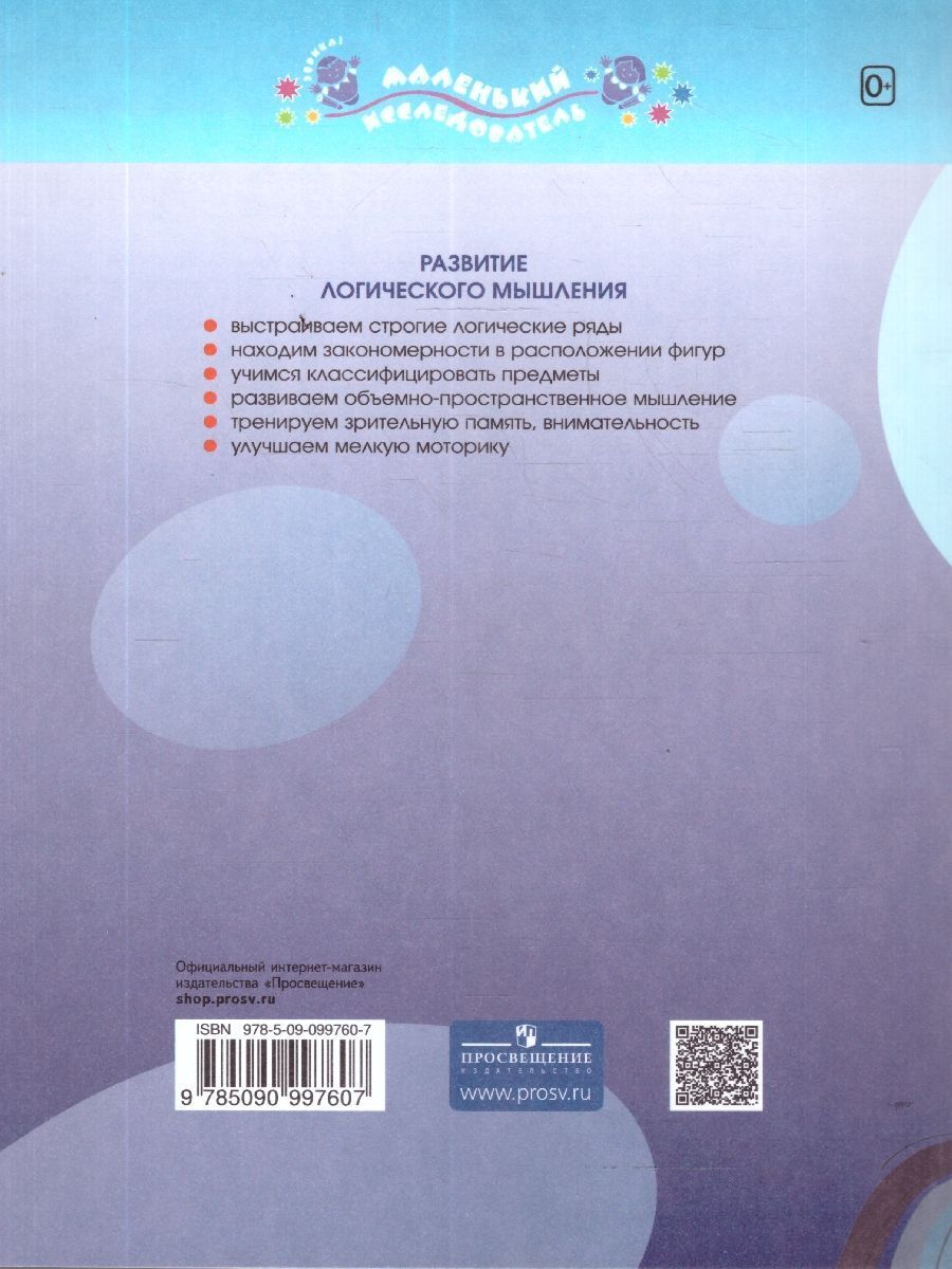 Тетрадь входит в учебно-методический комплект "Маленький исследователь" и предназначена для занятий с детьми 5-6 лет. Предложенные задания направлены на развитие у дошкольников зрительной памяти, внимания, пространственного воображения, умения находить закономерности, логически мыслить. Пособие рассчитано как на индивидуальную, так и на коллективную работу с детьми, например, в старших или подготовительных группах детского сада.Характеристики