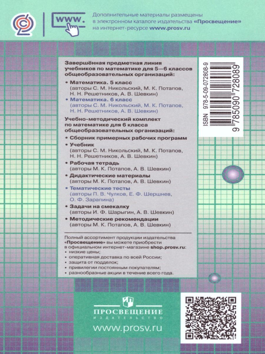 Пособие содержит тестовые задания по всем разделам учебника «Математика, 6» С.М. Никольского и др. Цель пособия ? помочь учителю в организации текущего контроля с использованием тестирования, что предполагает возможность оценки образовательных результатов ученика по каждому пункту учебника на каждом или почти каждом уроке.Характеристики