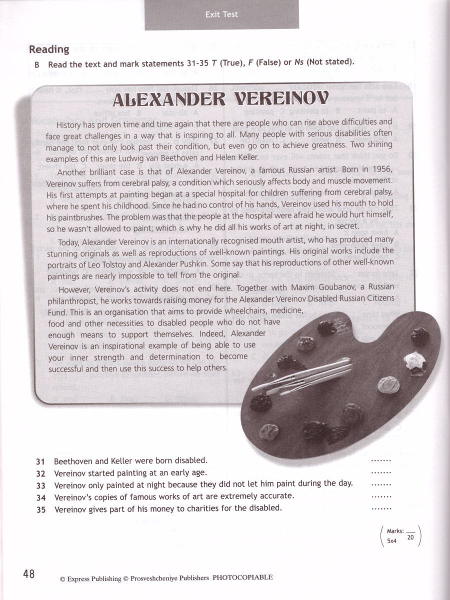 Сборник контрольных заданий является дополнительным компонентом УМК «Английский в фокусе-9» и включает контрольные задания в двух вариантах, которые выполняются по завершении работы над каждым модулем учебника. Помимо этого в сборнике дается материал для промежуточного контроля и итоговая годовая контрольная работа. Здесь же помещены ключи к контрольным работам и тексты заданий по аудированию. Все контрольные задания можно ксерокопировать. Сборник контрольных заданий в значительной мере обеспечивает процесс контроля на регулярной и объективной основе.Характеристики