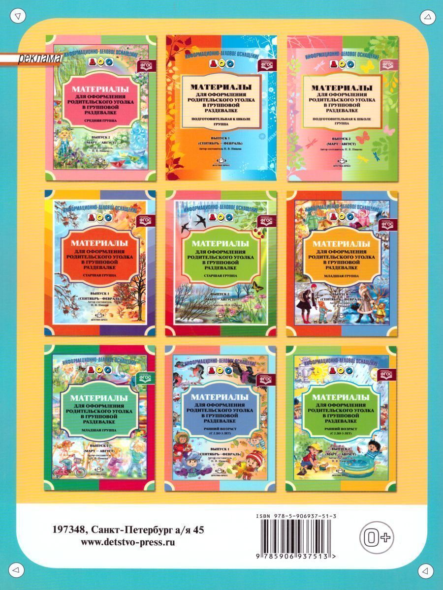 Издательство "Детство-пресс" продолжает выпуск серии "Информационно-деловое оснащение ДОО". Кроме материалов для общесадовских стендов теперь это и сменный материал для родительских уголков в групповых помещениях. В данном выпуске представлены материалы для родительского уголка в старшей группе детского сада с сентября по февраль включительно. Эти материалы помогут родителям организовать домашние развивающие занятия с ребенком, выбрать художественные произведения для чтения и заучивания. На страничках для родителей содержатся рекомендации по организации наблюдений за природой во время прогулок, приведены описания игр и упражнений, в процессе выполнения которых будут развиваться мыслительные операции, речь, моторика дошкольника. На каждый месяц года мы разработали по 4 странички с играми, упражнениями, рекомендациями. Все материалы соответствуют уровню общего развития детей шестого года жизни. Мы надеемся, что родительские уголки, оформленные с помощью предложенных материалов, не только привлекут внимание мам и пап, бабушек и дедушек, но и станут элементом оформления групповых раздевалок.Характеристики