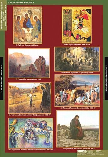 Таблицы Мировая художественная культура. Жанры в русской живописи 16 таблиц+64 карт. Комплект содержит 16 листов. Таблицы отпечатаны на плотном полиграфическом картоне 250-280 гр./м2, форматом 68x98 см. Печать односторонняя. Мелование одностороннее. Красочность 4+0(полноцвет). В комплект альбома входит брошюра с методическими рекомендациями для учителя. Состав комплекта: Историческая живопись. Религиозная живопись. Мифы, сказки, легенды в живописи. Портретная живопись. Пейзажная живопись. Бытовой жанр. Натюрморт. Смешение жанров. Художники - медалисты. + Карточки заданий.Характеристики
