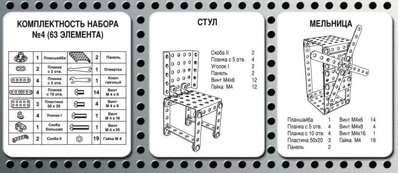 Это самый маленький конструктор в серии конструкторов для уроков труда. Он содержит всего 63 детали, из которых можно собрать только 2 несложные конструкции. «Десятое королевство» выпускает конструктор металлический 4 достаточно давно. Можно сказать, что он является одним из старожилов среди выпускаемых нашим предприятием железных конструкторов. Мы собирались даже снять его с производства, но постоянные заказы не позволяют этого сделать. Видимо, этот набор вполне подходит как учебное пособие для уроков труда в дошкольных образовательных учреждениях, где главная задача - обучение навыкам обращения с ключом и отверткой.Характеристики