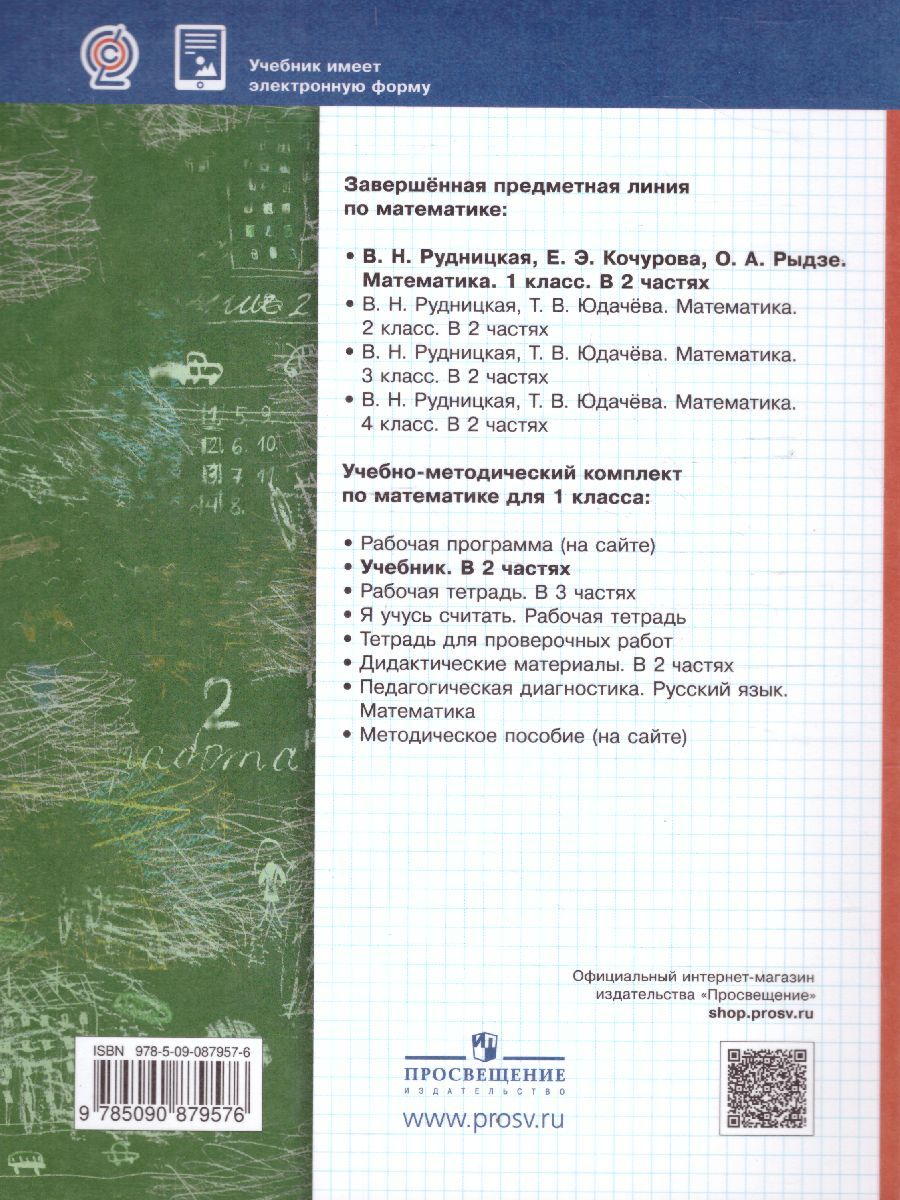 Учебник предназначен для изучения математики во втором полугодии 1 класса. Используется в комплексе с рабочей тетрадью №3 (автор Рудницкая В.Н.). Объём материала, представленного в учебнике, следует считать примерным; в зависимости от конкретных условий обучения учитель может использовать необходимое число упражнений. Соответствует федеральному государственному образовательному стандарту начального общего образования (2009 г.).Характеристики