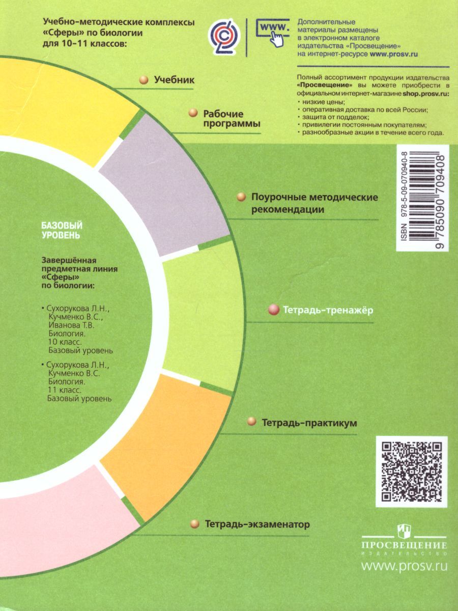Тетрадь-тренажёр является составной частью учебно-методического комплекса «Биология» для 10–11 классов линии «Сферы». В ней содержатся задания для самостоятельной работы учащихся в соответствии с Федеральным государственным образовательным стандартом среднего общего образования. Главная особенность тетради заключается в её фиксированном формате, при котором задания в рамках каждой темы сгруппированы по видам работ, соответствующим формируемым в курсе биологии умениям и навыкам. Это обеспечивает возможность их отработки на разных по содержанию заданиях. Использование тетради-тренажёра ориентировано на активизацию процесса обучения и работы на результат. Этому способствует введение системы набора баллов за каждый вид работы, при этом выставление оценки в ней не является обязательным.Характеристики