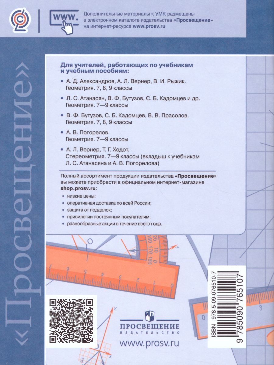 Рабочие программы основного общего образования по геометрии содержат следующие разделы: пояснительную записку; особенности содержания математического образования на этой ступени; место геометрии в базисном учебном (образовательном) плане; требования к результатам обучения и освоения содержания курса; содержание курса по основным линиям; примерное тематическое планирование с описанием видов учебной деятельности учащихся 7–9 классов и указанием примерного числа часов на изучение соответствующего материала; рекомендации по оснащению учебного процесса. Программы предназначены учителям, работающим по УМК авторов А. Д. Александрова и др., Л. С. Атанасяна и др., В. Ф. Бутузова и др., А. В. Погорелова. Пособие доработано в соответствии с программой, принятой 8 апреля 2015 г.Характеристики