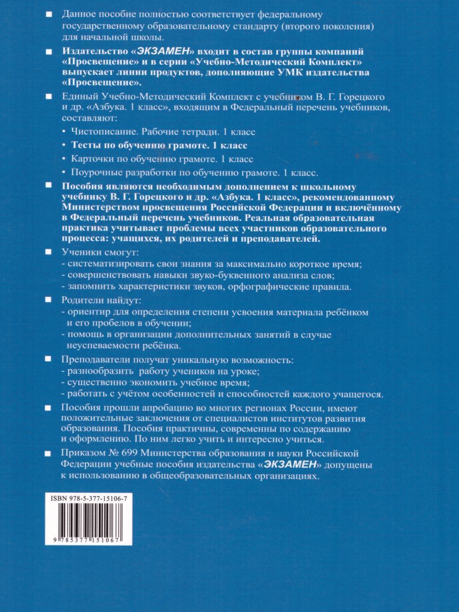 Данное пособие полностью соответствует федеральному государственному образовательному стандарту (второго поколения) для начальной школы. Тесты по обучению грамоте помогут учащимся в изучении и систематизации учебного материала за максимально короткое время. Они способствуют не только быстрой проверке знаний, но и более глубокому усвоению программы, тренируют ученика по разным направлениям грамматических умений, совершенствуют навыки звукобуквенного анализа слов, расширяют словарный запас, помогут запомнить характеристику звуков, орфографические правила, изучаемые в первом классассе, развивают устную и письменную речь, воображение ребёнка. Тесты могут использоваться при прохождении материала по любой программе.Характеристики
