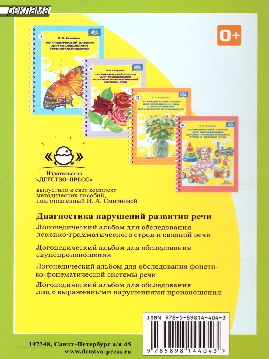 Настоящий альбом предназначен для стандартного логопедического обследования. С помощью наглядного материала, представленного в альбоме, выявляется сформированность психических функций, обеспечивающих усвоение чтения и письма. Материал позволяет также оценить знание печатных и рукописных букв, правильность письма и чтения, понимание читаемого. Для логопедов.Характеристики