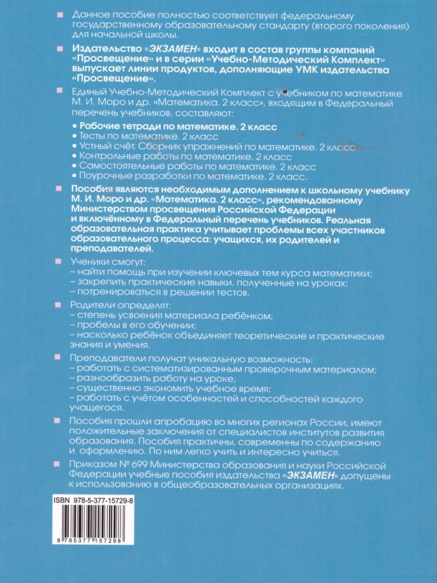 Данное пособие полностью соответствует федеральному государственному образовательному стандарту (второго поколения) для начальной школы. Рабочая тетрадь по математике предназначена для самостоятельной работы учащихся. Задания в тетради соответствуют учебнику М. И. Моро и др. "Математика. 2 класс". Учителя, работающие по другим учебным программам, также могут использовать данную тетрадь по математике для самостоятельных, дополнительных и домашних работ. В рабочей тетради собраны разнообразные упражнения, которые помогут не только отработать программный материал, но и способствуют развитию наблюдательности, логики, образного восприятия, памяти.Характеристики