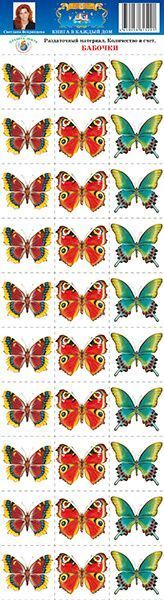Издание представляет собой: лист плотного мелованного картона (пл. 280 гр) с изображением бабочек. Издание предназначено для: организации занятий, развивающих игр, индивидуальной работы с детьми (по обучению детей счёту). Размер разрезных карточек 40x40 мм.Характеристики