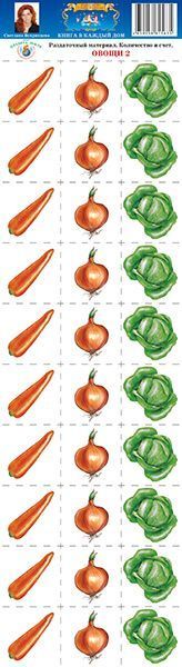 Издание представляет собой: лист плотного мелованного картона (пл. 280 гр) с изображением овощей. Издание предназначено для: организации занятий, развивающих игр, индивидуальной работы с детьми (по обучению детей счёту). Размер разрезных карточек 40x40 мм.Характеристики