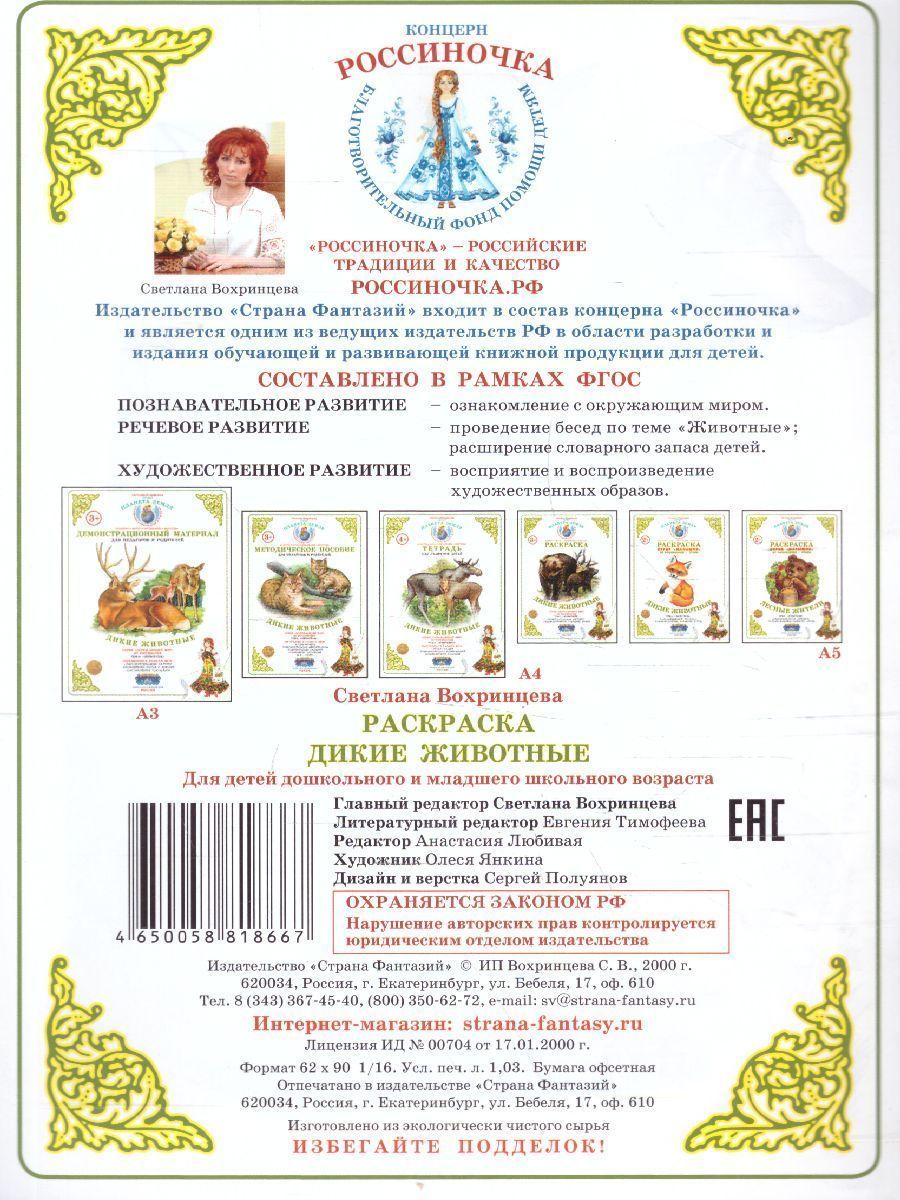 Книжка-раскраска содержит яркие иллюстрации на тему «Дикие животные». Контуры картинок для раскрашивания чёткие, тщательно прорисованные. Предназначена для: формирования и расширения представлений детей о диких животных; развития познавательных интересов и творческих способностей (улучшения навыков изобразительной деятельности); развития навыков устной речи.Характеристики