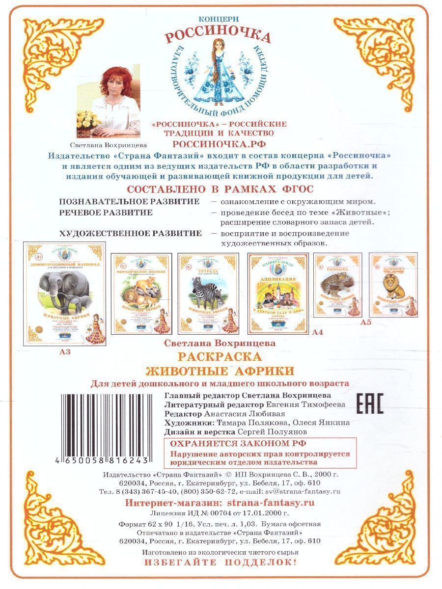 Книжка-раскраска содержит яркие иллюстрации на тему «Животные Африки». Контуры картинок для раскрашивания чёткие, тщательно прорисованные. Предназначена для: формирования и расширения представлений детей о животных Африки; развития познавательных интересов и творческих способностей (улучшения навыков изобразительной деятельности); развития навыков устной речи.Характеристики