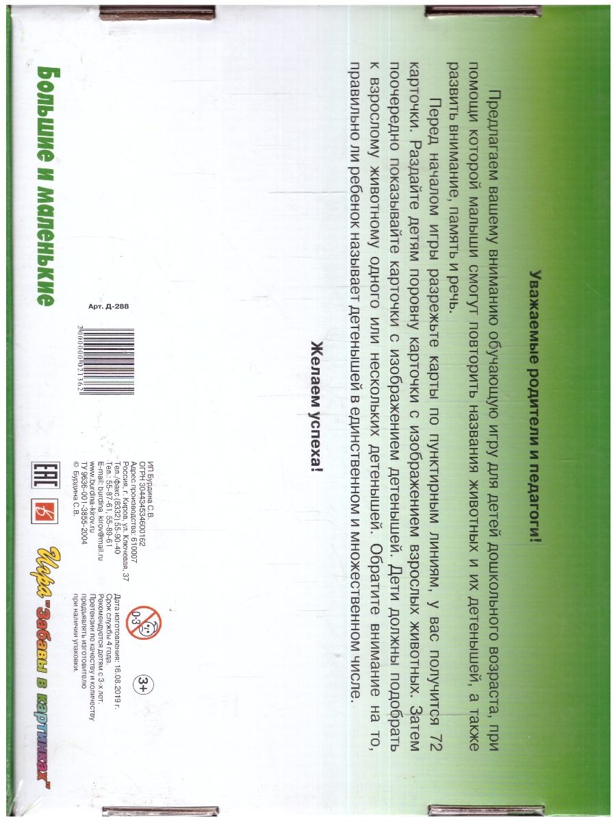 Обучающая игра для детей дошкольного возраста, при помощи которой малыши смогут повторить названия животных и их детенышей, а также развить внимание, память и речь. Перед началом игры разрежьте карты по пунктирным линиям, получится 72 карточки. Раздайте детям поровну карточки с изображением взрослых животных. Затем поочередно показывайте карточки с изображением детенышей. Обратите внимание на то, правильно ли ребенок называет детенышей в единственном и множественном числе. Игра-лото для занятий в группах детских садов и дома индивидуально. Для детей от 3-х лет.Характеристики