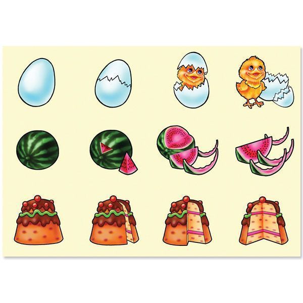 Развивающие игры прекрасно подходят для занятий в группах детских садов. Предложите ребятам проверить внимательность и сообразительность! Цель игры – составить цепочку из 4 картинок. Ребенок находит взаимосвязь между предметами и располагает их в нужной последовательности. Например, солнце проходит по небу от восхода до заката, на фундаменте вырастает большой дом. Вместе с развитием логического мышления ребенок знакомится с окружающим миром. Состав набора: 8 разрезных карточек (24 цепочки). Размер карточки: 27,5х20 см. Материал: картон.Характеристики