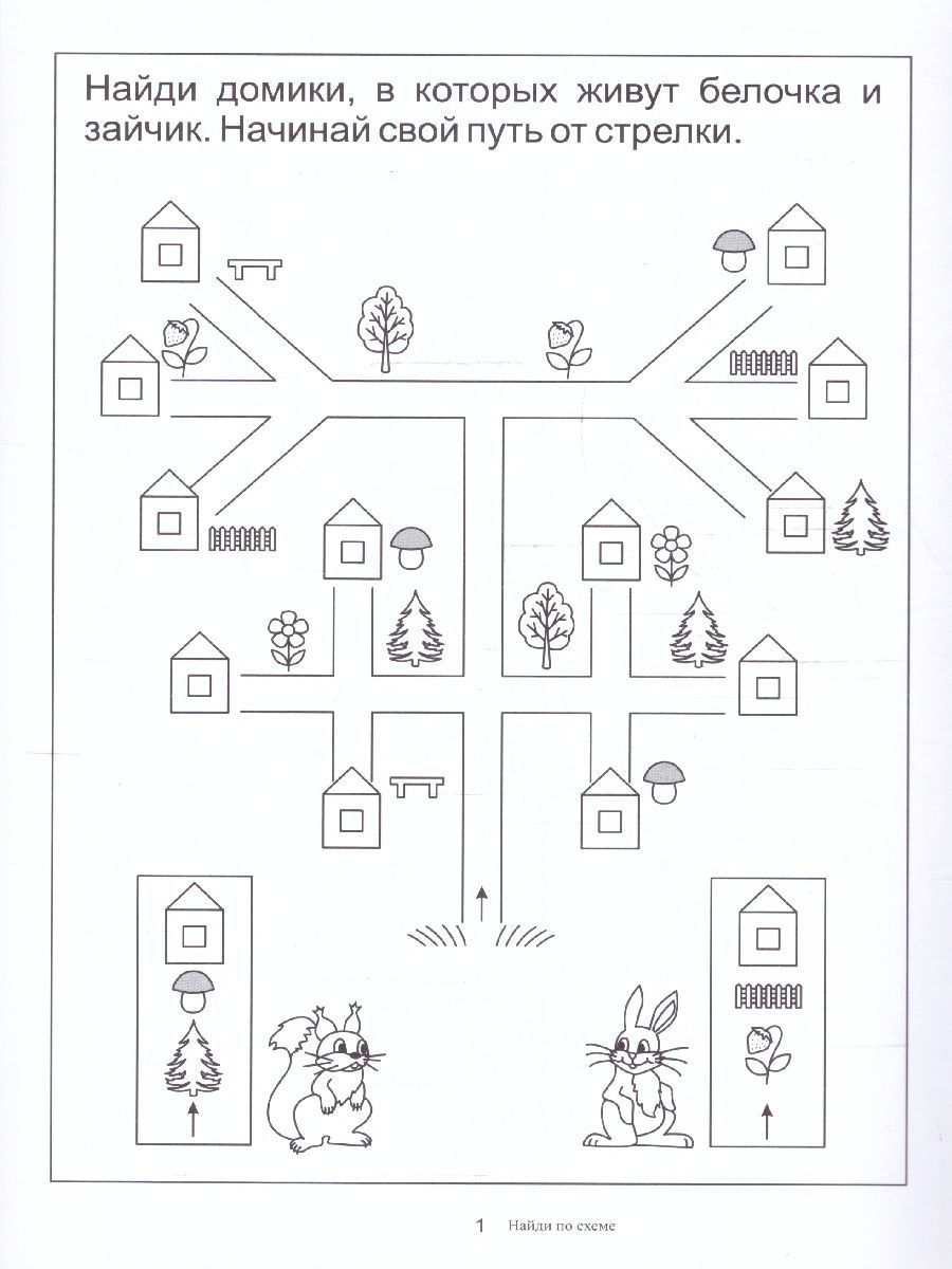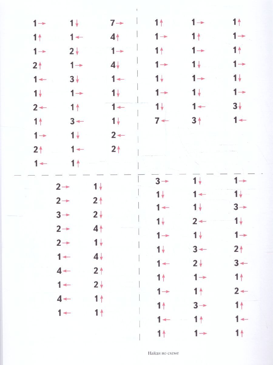 Найди по схеме. Папка дошкольника. Папка дошкольника поможет ребенку: • развить зрительное восприятие, внимание; • научиться ориентироваться в пространстве, а также на листе бумаги; • развить пространственное мышление. Цветной вкладыш необходимо разрезать по пунктирным линиям. Получится 8 карточек, на которых зашифрованы графические фигурки. Малыш должен изобразить эти фигурки на листе в клетку. Попросить ребенка комментировать во время выполнения задания свои действия, например: одна клетка направо, одна клетка вниз, три клетки налево и т.д.Папка дошкольника поможет ребенку: • развить зрительное восприятие, внимание;Характеристики