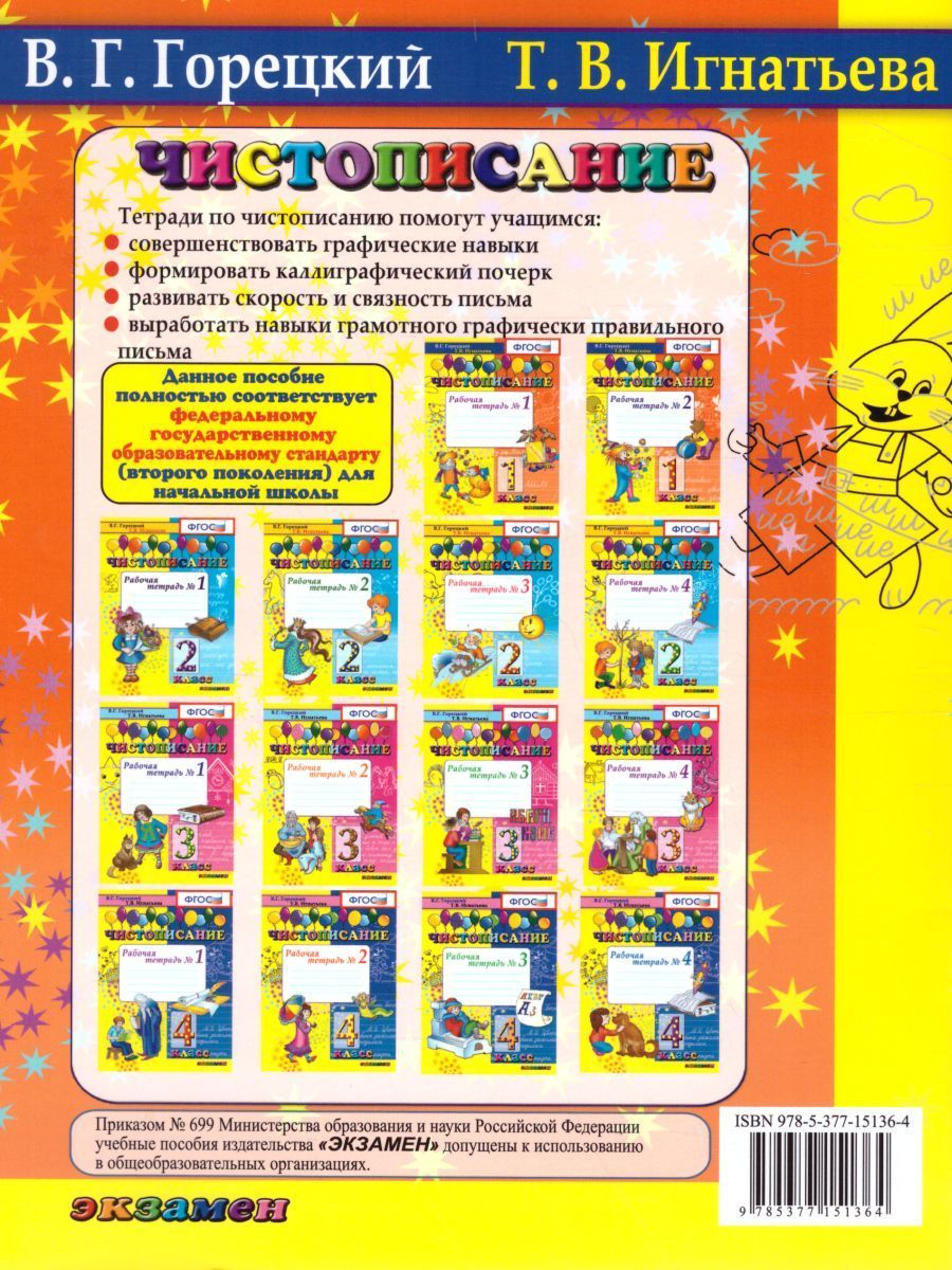 Тетради по чистописанию отличаются систематизированным подходом к формированию почерка учащихся, что является одной из главных задач начальной школы. В тетрадях используются разнообразные методы совершенствования почерка: это и копировальный метод, и метод визуализации. Росчерки вносят в процесс обучения элемент творчества, художественной изобретательности, они тренируют глазомер детей, совершенствуют мускулатуру кисти руки и пространственную ориентацию. Комплект рабочих тетрадей можно использовать на минутках чистописания на уроке, для домашних занятий и работы на факультативе, так как они обеспечивают весь необходимый материал для проведения занятия и могут быть использованы с любым учебником русского языка.Характеристики