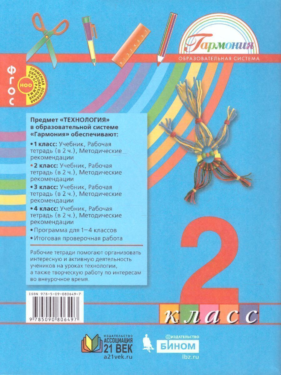 Рабочая тетрадь № 2 входит в учебно-методический комплект с учебником технологии для 2 класса автора Н. М. Конышевой; она предназначена для индивидуального использования учеником и рассчитана на работу в течение второго полугодия. Тетрадь содержит материалы трёх основных видов: 1) задания по основному содержанию учебника (задачи на построение, дорисовывание, разработку эскизов, творческие задачи и т. п.); 2) дополнительные изделия для вариативной работы на уроке или для изготовления в свободное время; 3) специальные листы приложения, предназначенные для вырезания деталей, наклеивания композиций. Тетрадь существенно облегчает подготовку материальной базы уроков, позволяет экономить время урока и повышать его эффективность. Тетрадь поможет: углубить знания о символике в сюжетах и декоре отдельных изделий по мотивам народных образцов; освоить главное правило дизайна вещей «Красота+Польза», использовать его в практической работе при изготовлении изделий; читать и строить простейшие чертежи разверток прямоугольныхХарактеристики