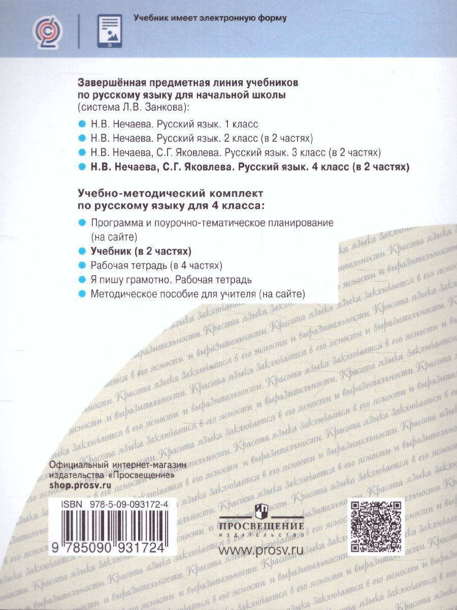 Учебник 4 класса завершает курс русского языка начальной школы. В основу курса заложена идея реализации объективно существующего единства двух составляющих языка: системы языка и речи. Главная задача учебника — научить грамотно общаться в устной и письменной форме. Эта задача реализуется включением учеников в исследовательскую деятельность, в активные формы познания. Материалы учебника способствуют развитию коммуникативной грамотности, информационной культуры, воспитанию умения учиться, самостоятельному добыванию знаний, формированию взаимо- и самоконтроля, учебной рефлексии. Тем самым открывают широкие возможности для достижения предметных и метапредметных результатов.Характеристики