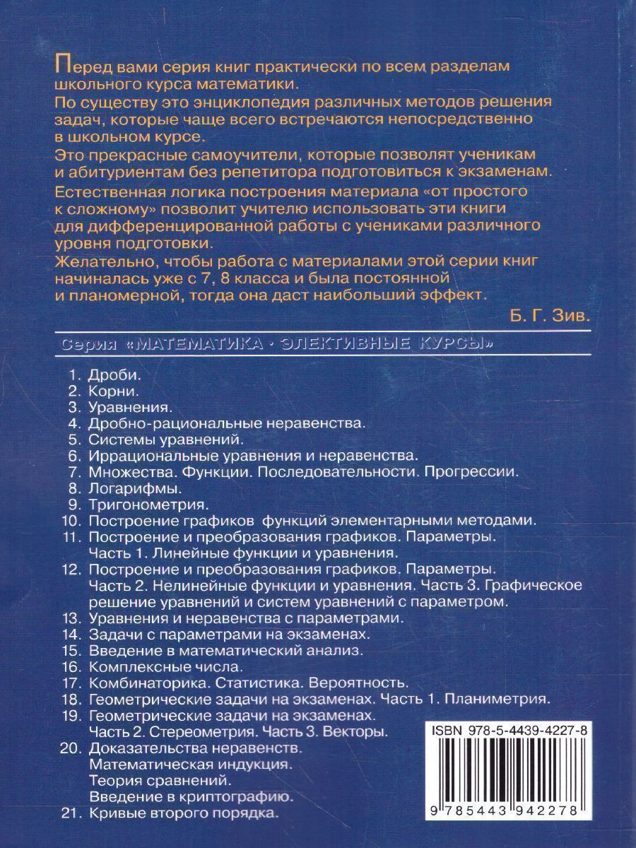 Данное пособие предназначено для углубленного изучения школьного курса математики, содержит большое количество разноуровневого тренировочного материала. В книге представлена программа для проведения элективных курсов в профильных и предпрофильных классах. Пособие адресовано широкому кругу учащихся, абитуриентов, студентов педагогических вузов, учителей.Характеристики