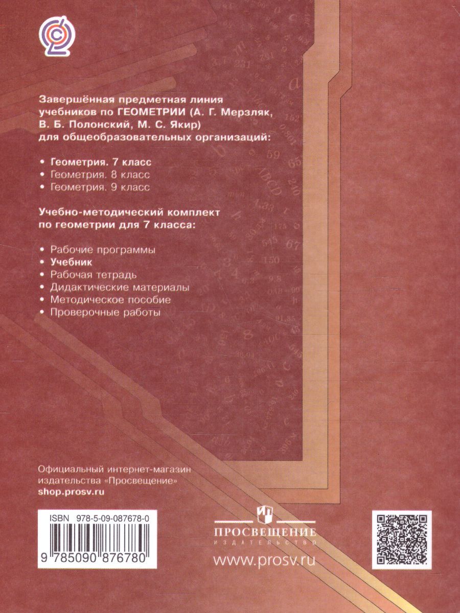Учебник предназначен для изучения геометрии в 7 классе общеобразовательных организаций. В нём предусмотрена уровневая дифференциация, позволяющая формировать у школьников познавательный интерес к математике. Учебник соответствует Федеральному государственному образовательному стандарту основного общего образования.Характеристики
