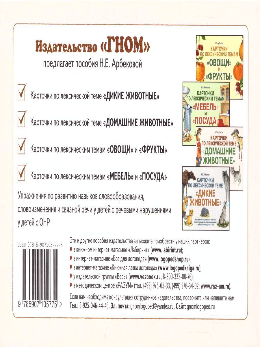 В данный комплект входит 30 двусторонних карточек с изображениями самцов, самок и детенышей домашних животных и птиц в единственном и множественном числе и опорные карточки с символами и схематичными изображениями различных предметов (для составления рассказов-описаний и рассказов-сравнений). Комплект адресован логопедам и предназначен для проведения работы по развитию навыков словообразования, словоизменения и связной речи у детей с общим недоразвитием речи на индивидуальных, подгрупповых или фронтальных занятиях.Характеристики