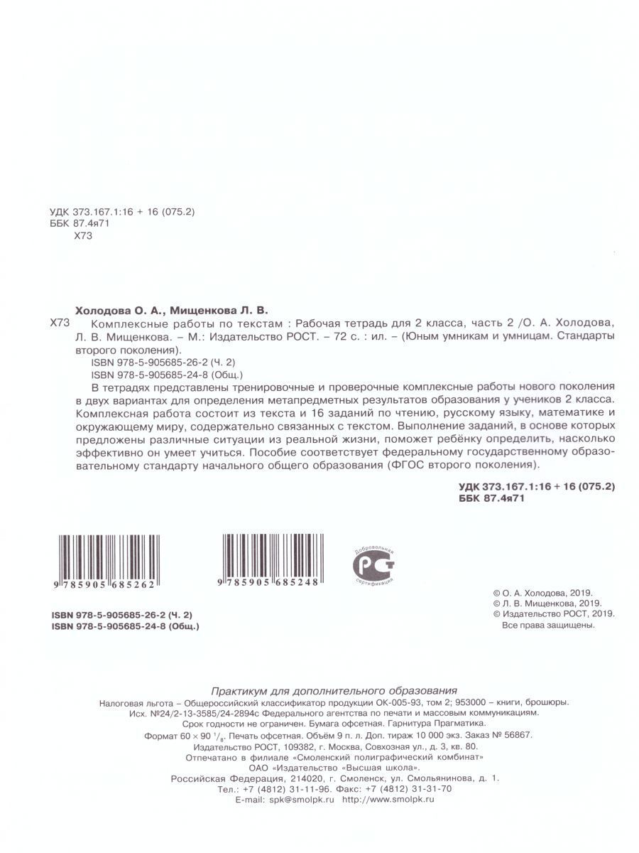 В тетрадях представлены тренировочные и проверочные комплексные работы нового поколения в двух вариантах для определения метапредметных результатов образования у учеников 2 класса. Комплексная работа состоит из текста и 16 заданий по чтению, русскому языку, математике и окружающему миру, содержательно связанных с текстом. Выполнение заданий, в основе которых предложены различные ситуации из реальной жизни, поможет ребёнку определить, насколько эффективно он умеет учиться. Пособие соответствует Федеральному государственному образовательному стандарту начального общего образования (ФГОС второго поколения).Характеристики
