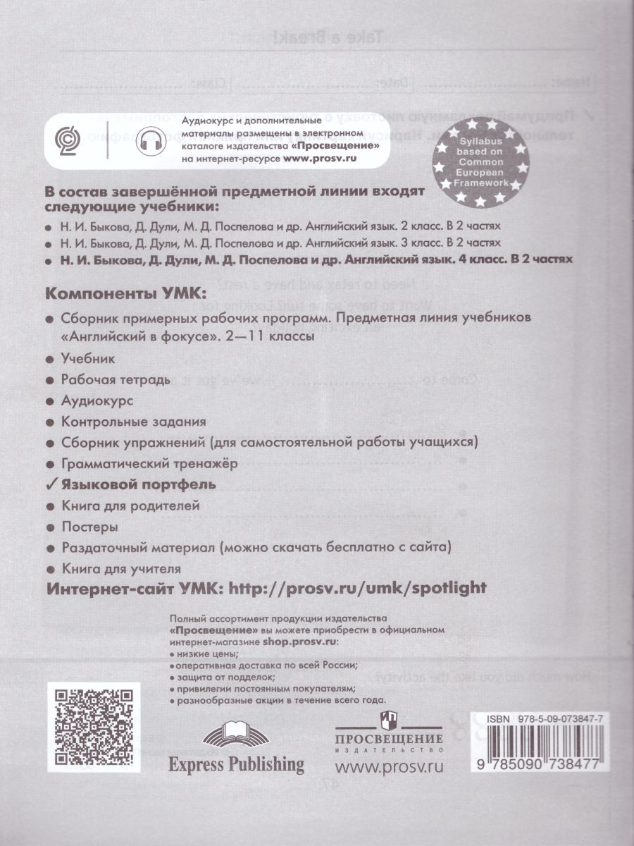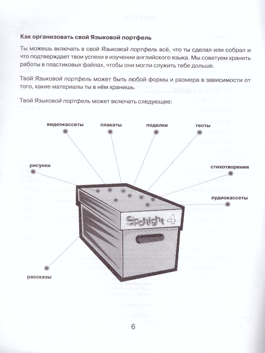 Языковой портфель (Portfolio) является неотъемлемым компонентом УМК «Английский в фокусе», который позволит учащимся собрать все свои достижения (письменные работы продуктивного и творческого характера, аудиозаписи собственных диалогов и т. д.) и оценить уровень полученных знаний в конце обучения.Характеристики